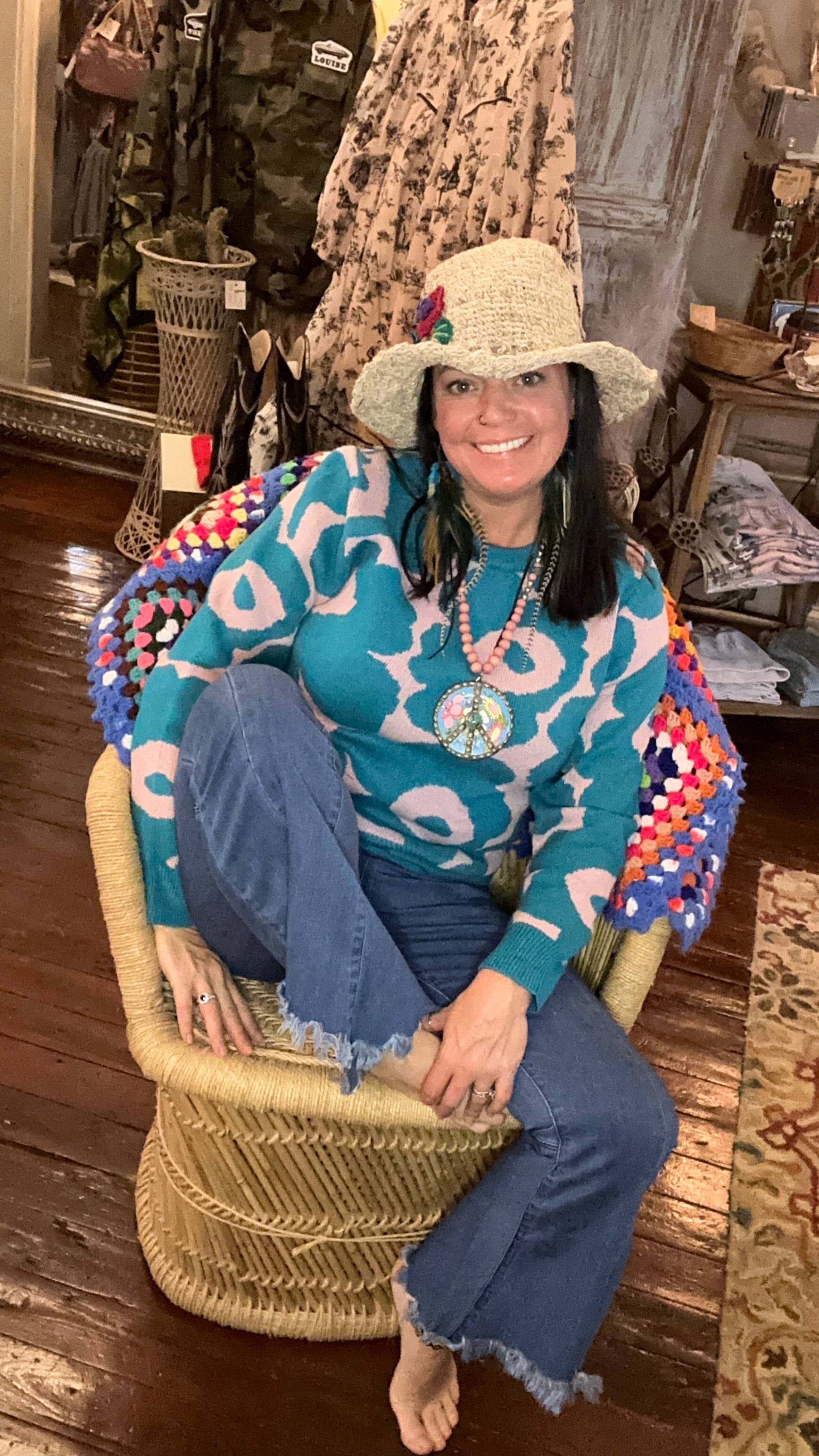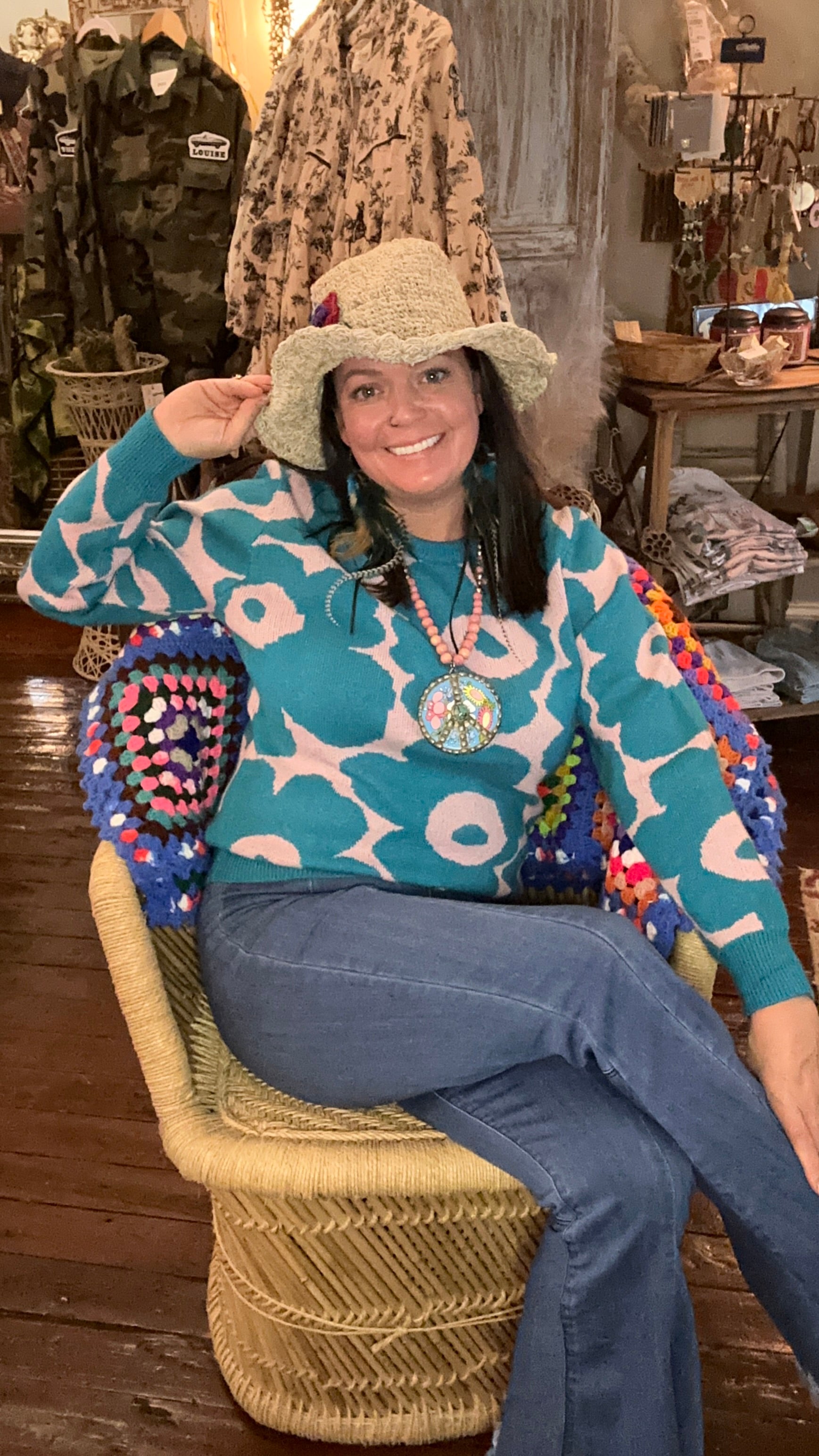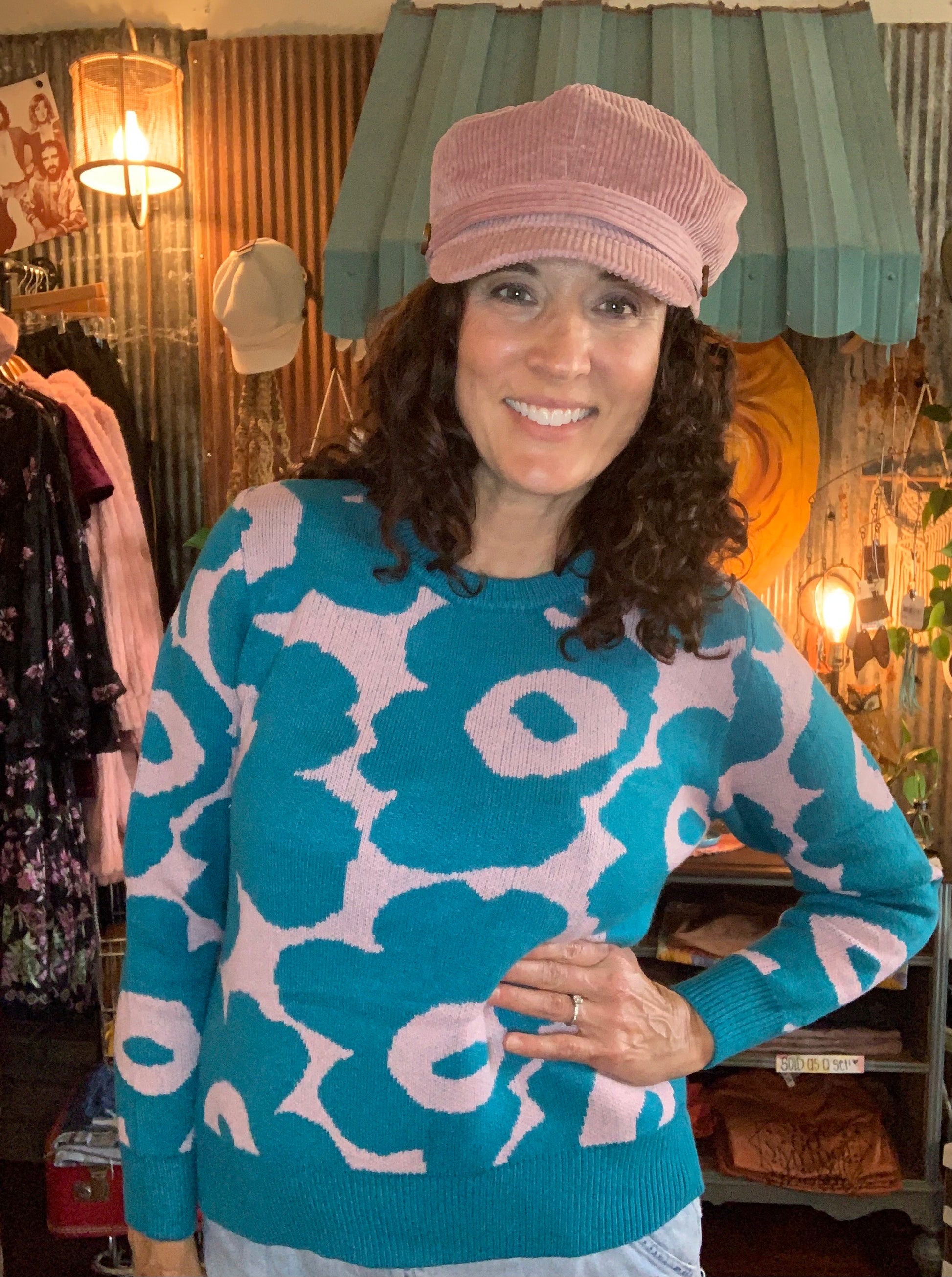 This soft pink and bright teal sweater has a cute pattern with its big flowers!