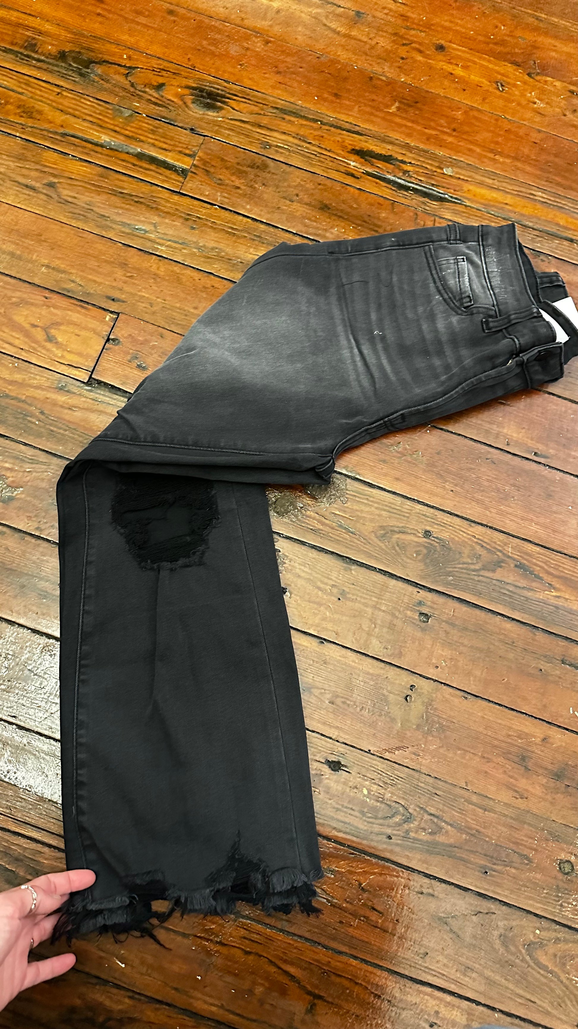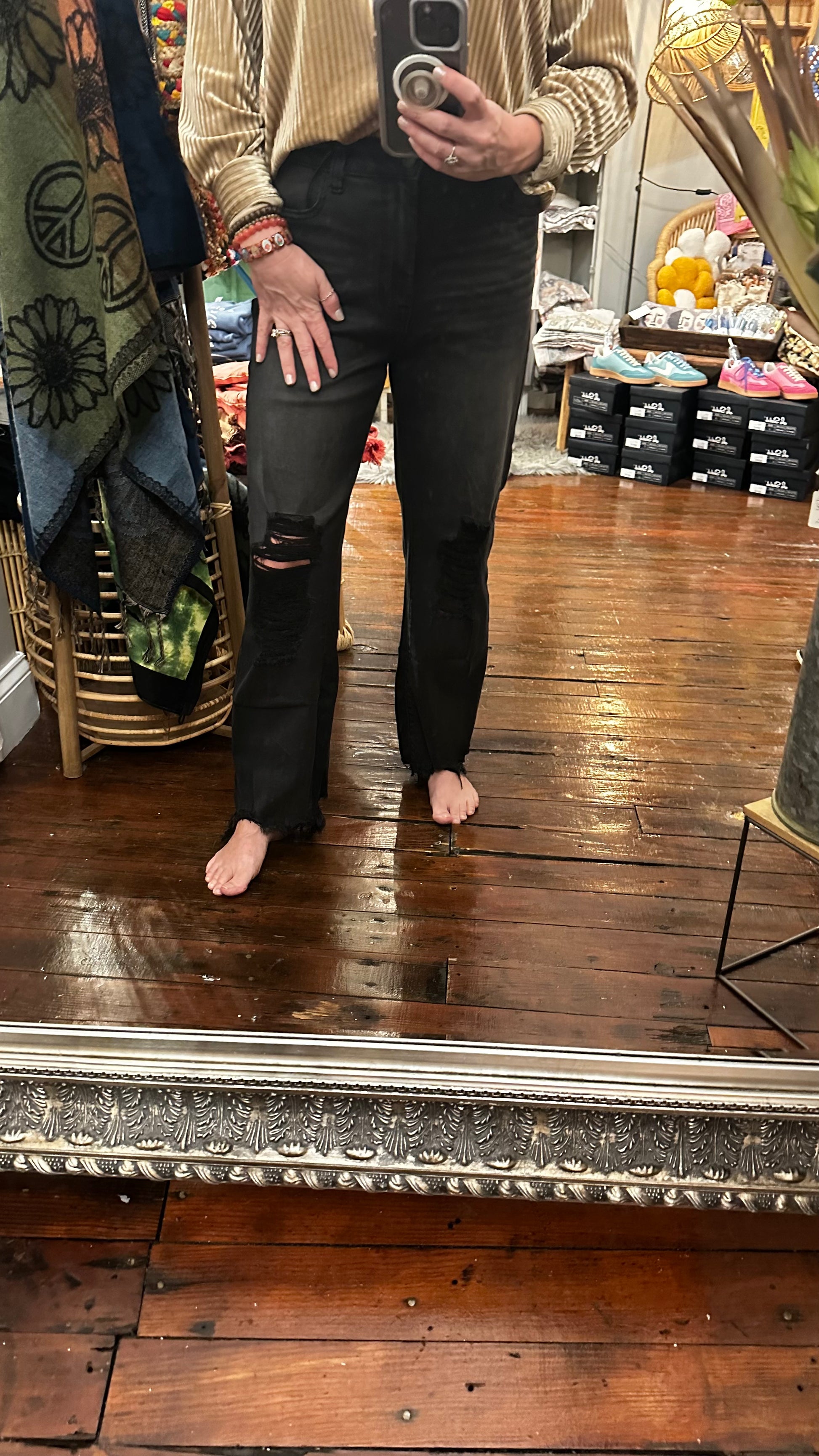 A lot of stretching these comfortable raw hem jeans. I’d say it’s safe to size down.