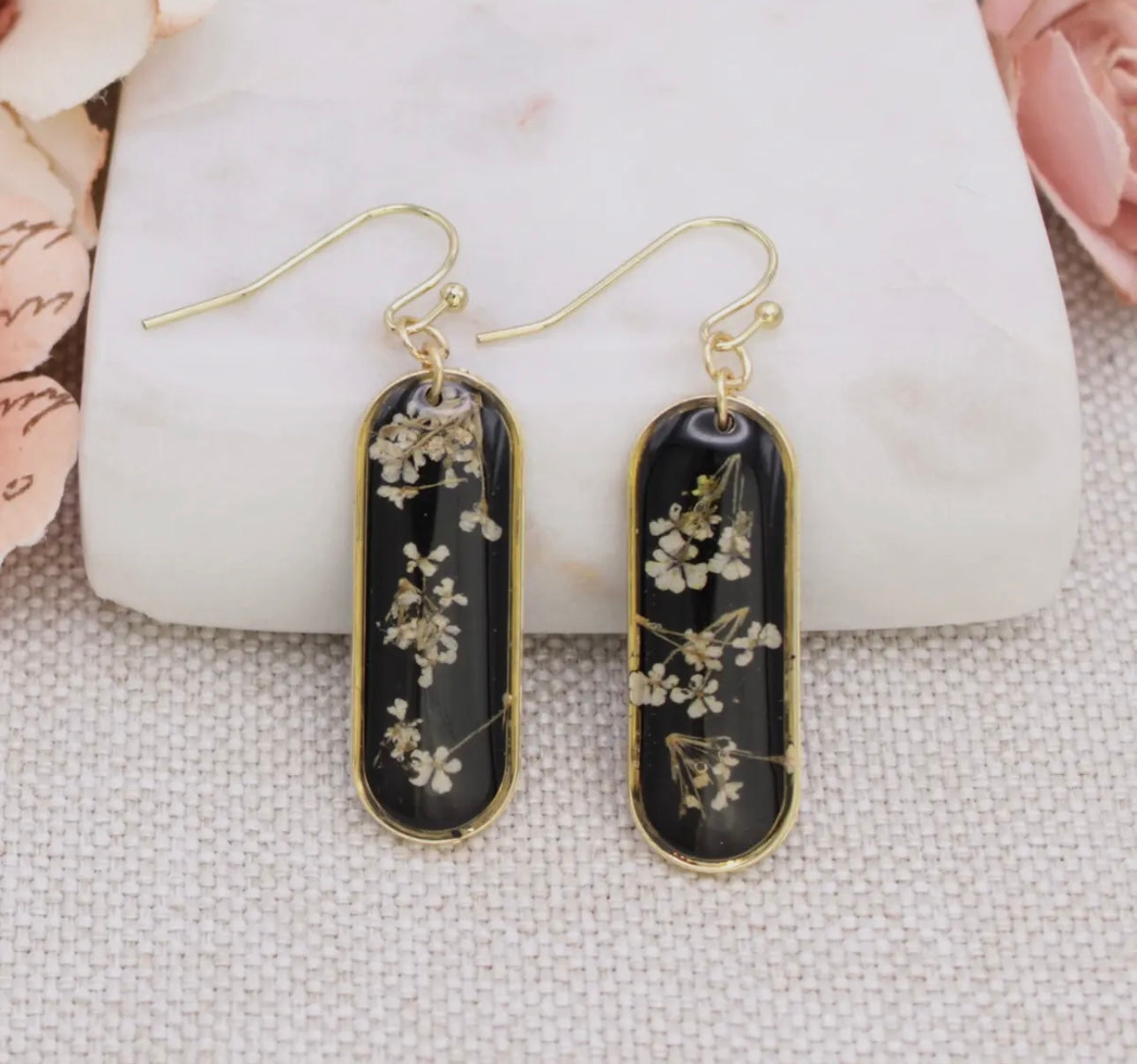 Infuse nature into your style with these gold rounded bar white baby's breath dried flower earrings. These chic gold bordered black bars include bunches of dried pale white florals, creating a timeless yet fresh look. Make a fashionable and floral statement with these vintage inspired dried flower earrings. * Made in China * Genuine dried flowers set in black acrylic * White floral vintage gold earrings * Measures: 13/4 x 3/8" * Materials: Gold Tone Metal, Acrylic, Genuine Dried Flowers