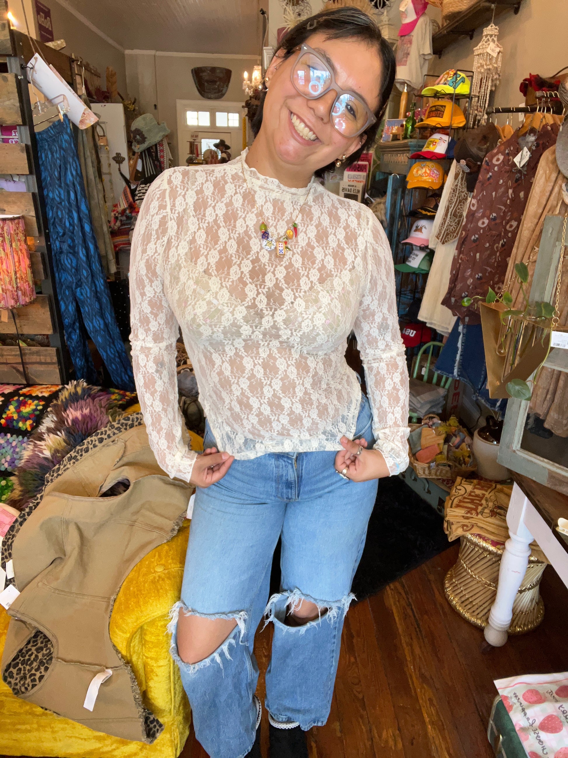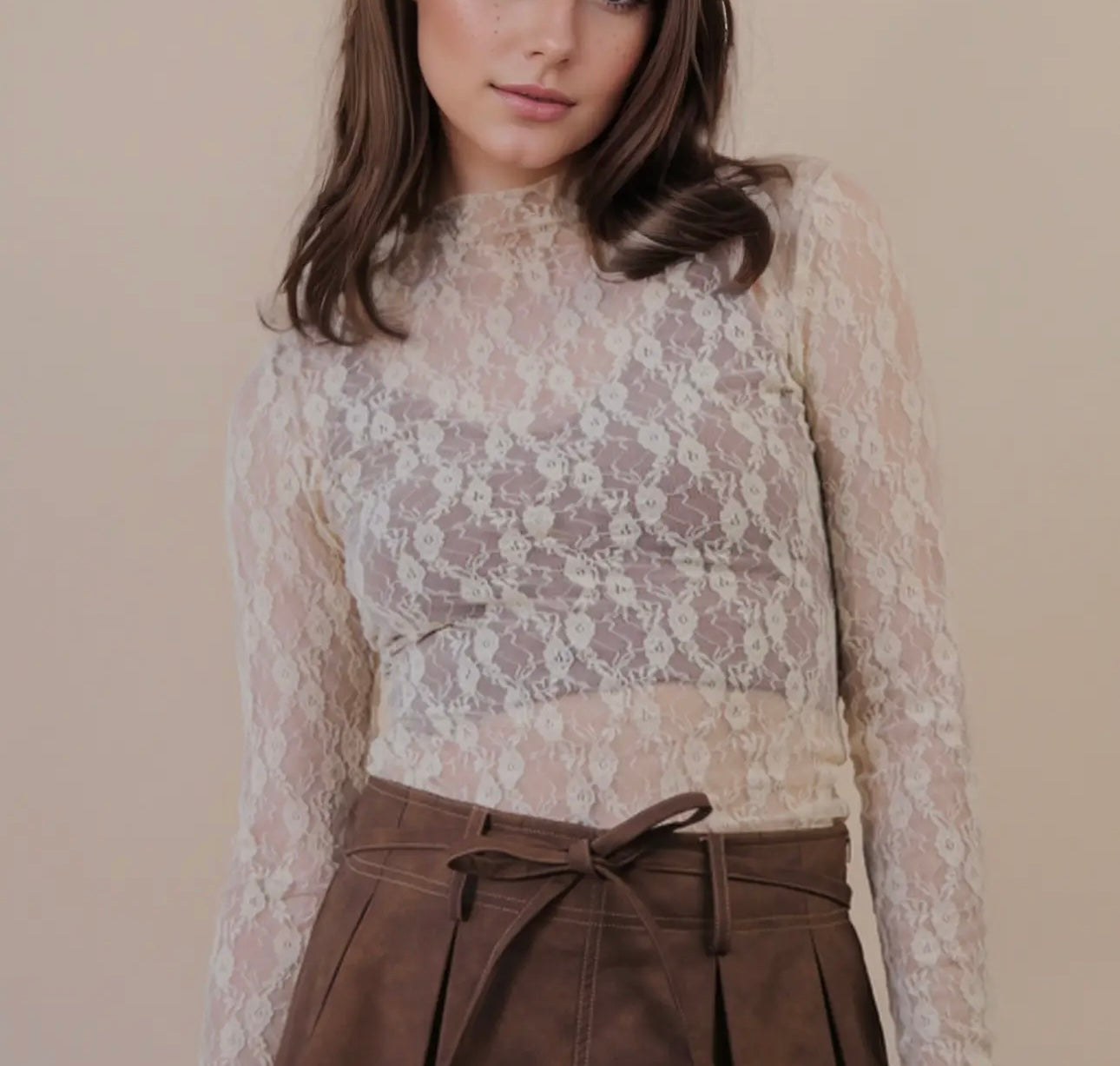 - High Neck Fitted Sheer Mesh Lace Knit Top