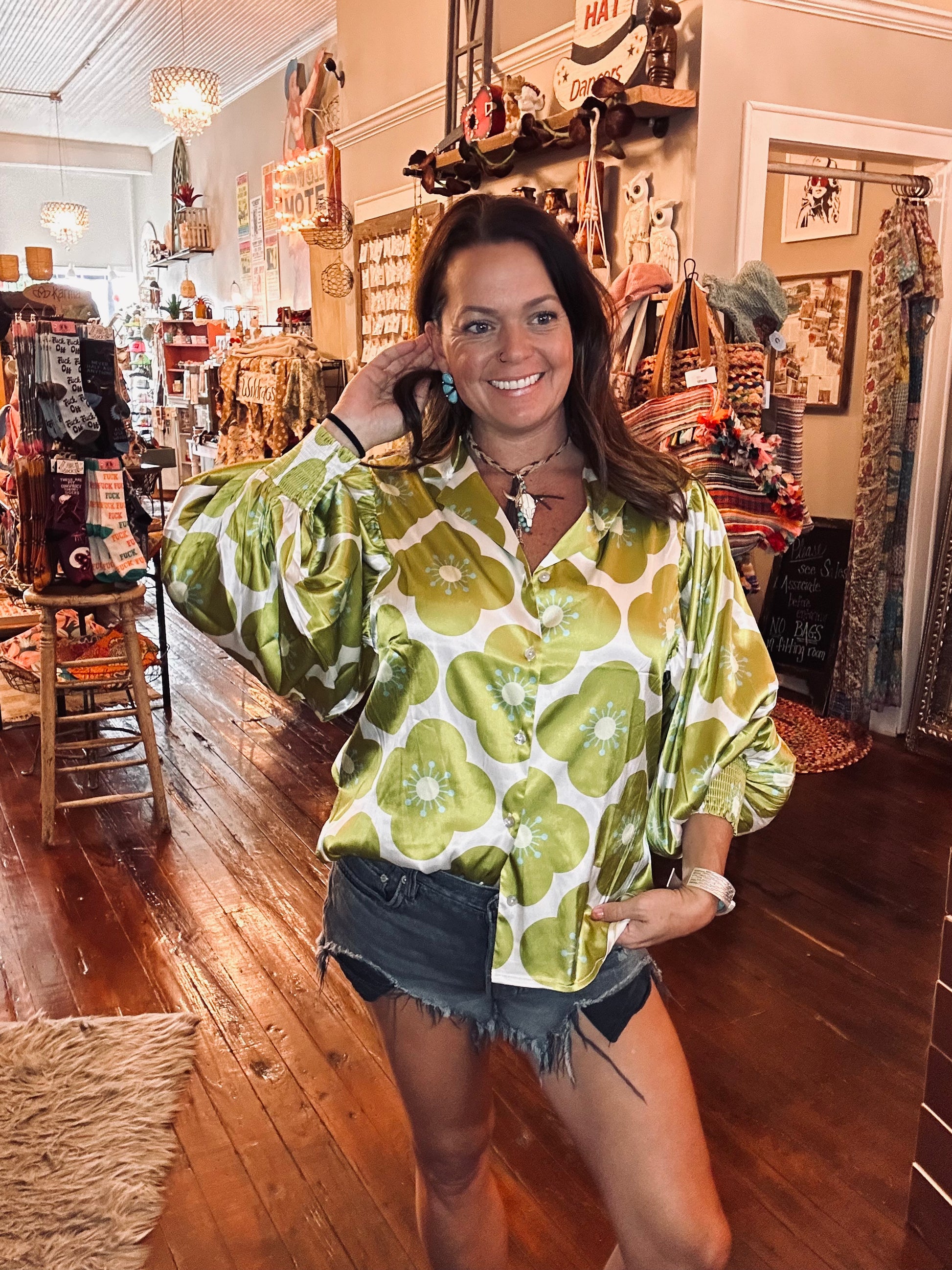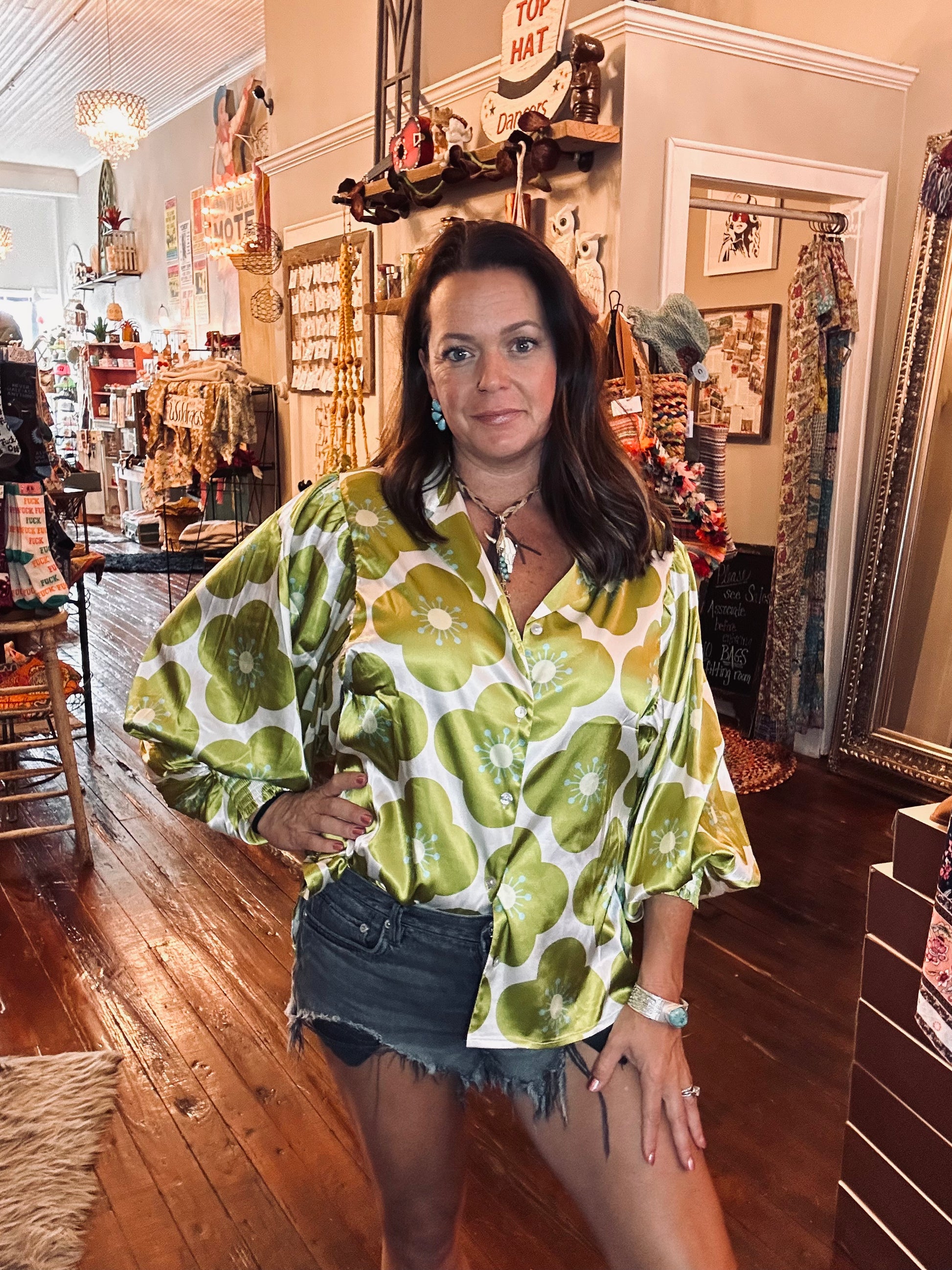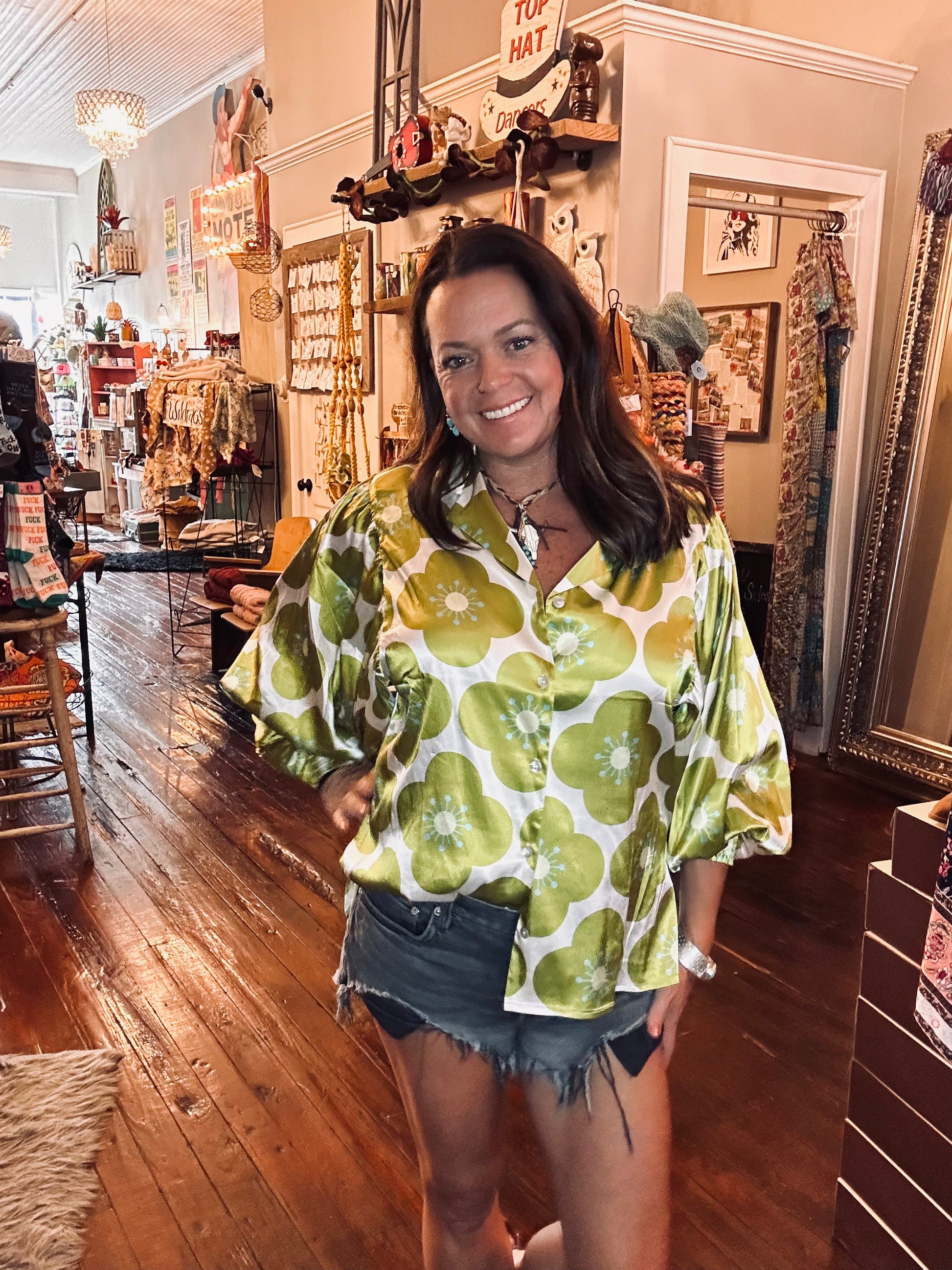 Probably our favorite of this collection! This top has a subtle proof sleeve with beautiful colors, including turquoise!