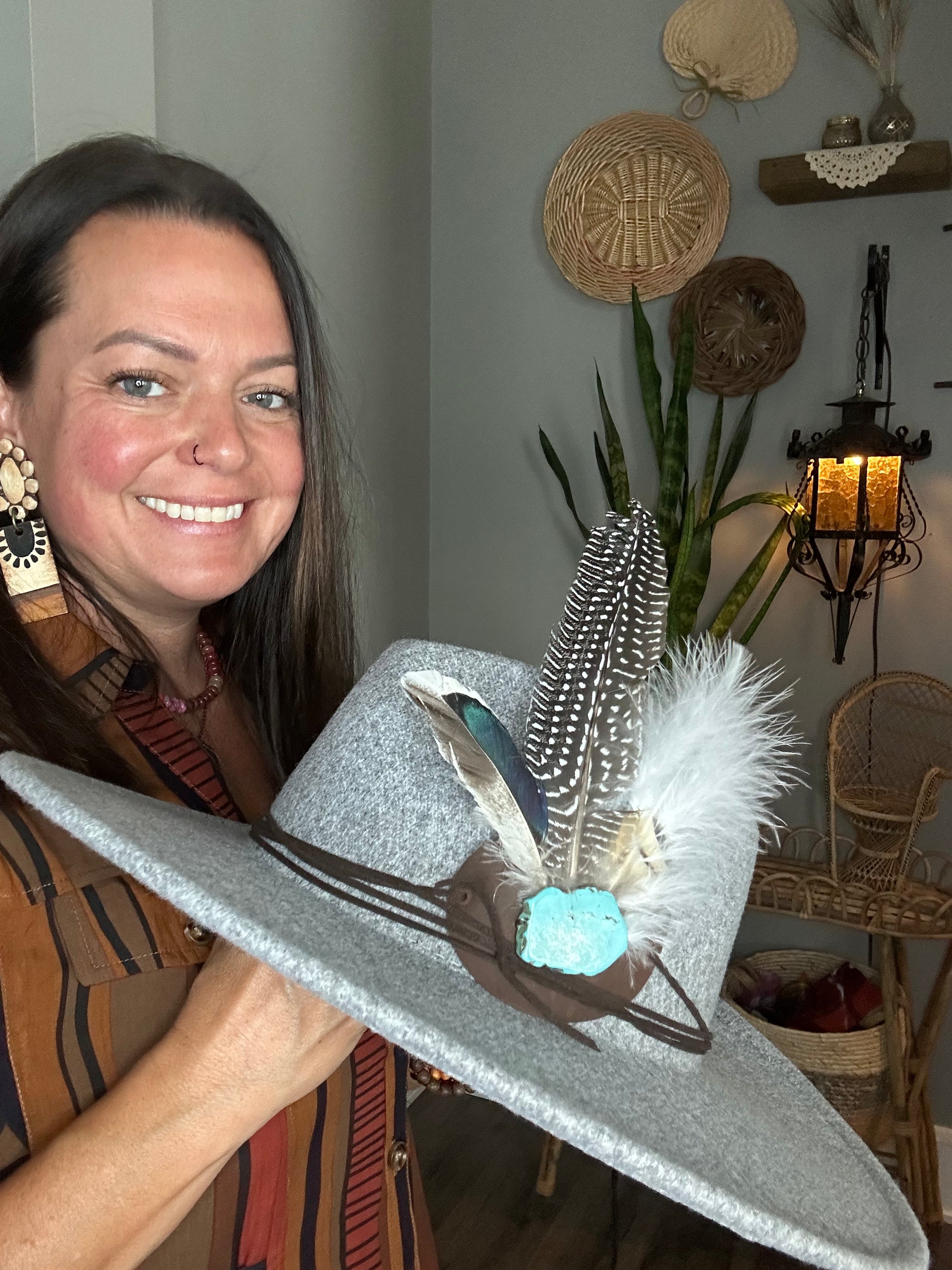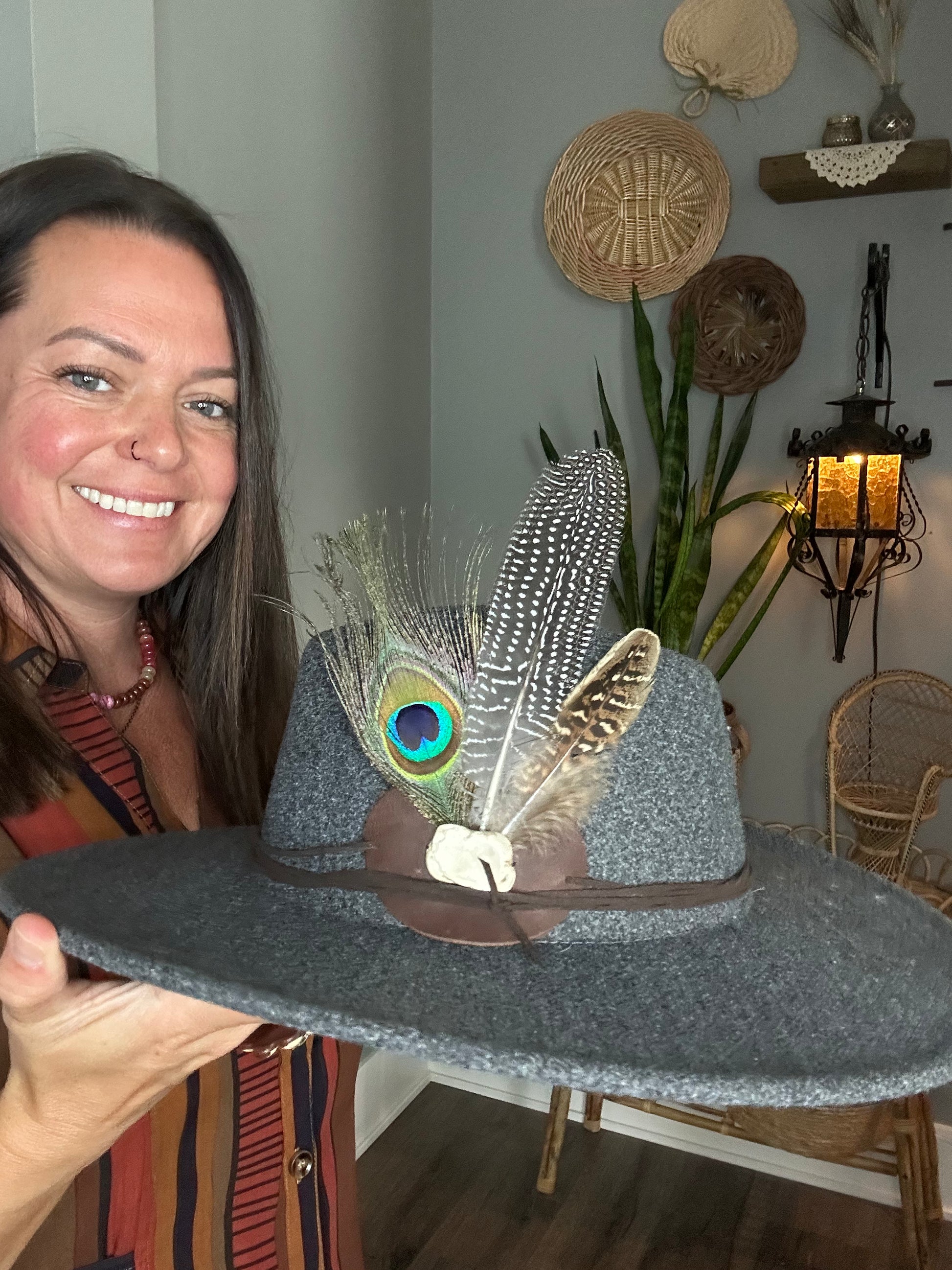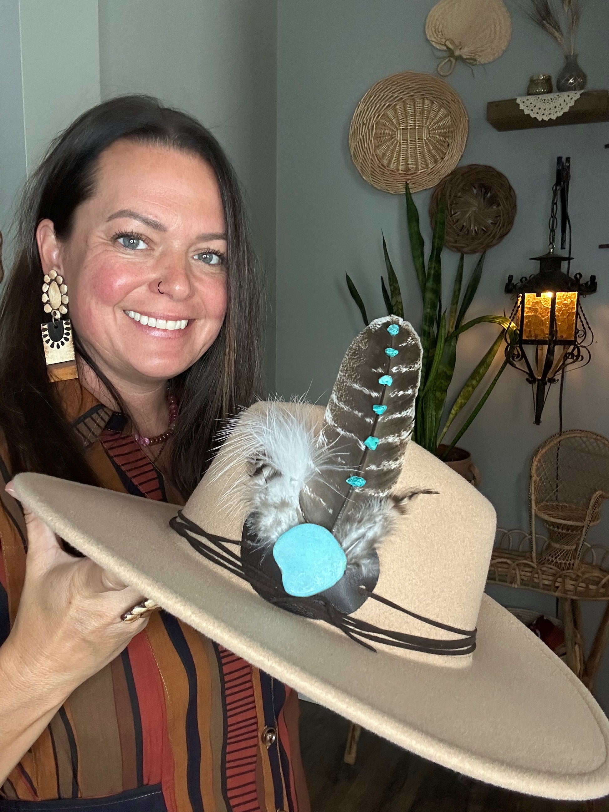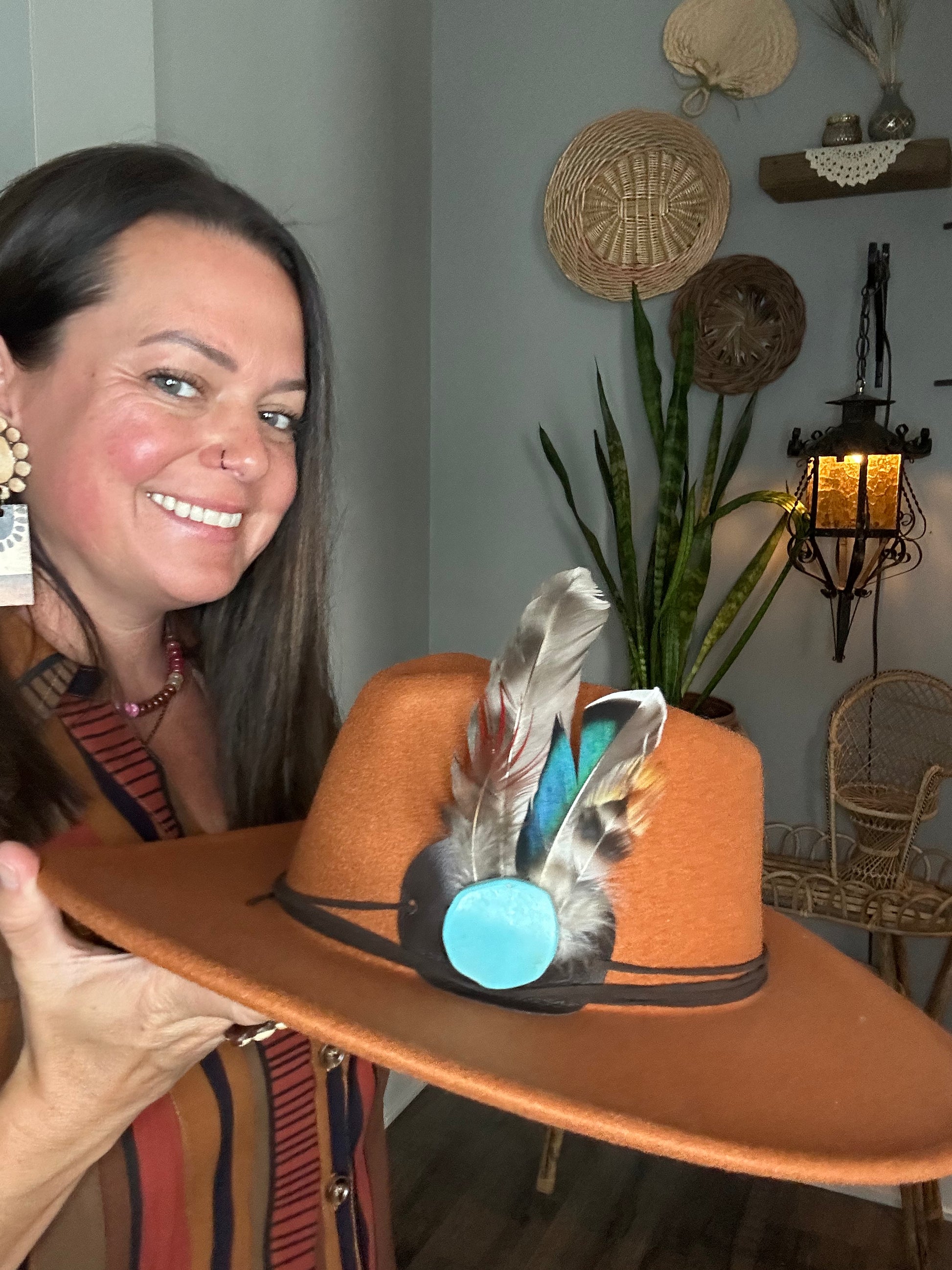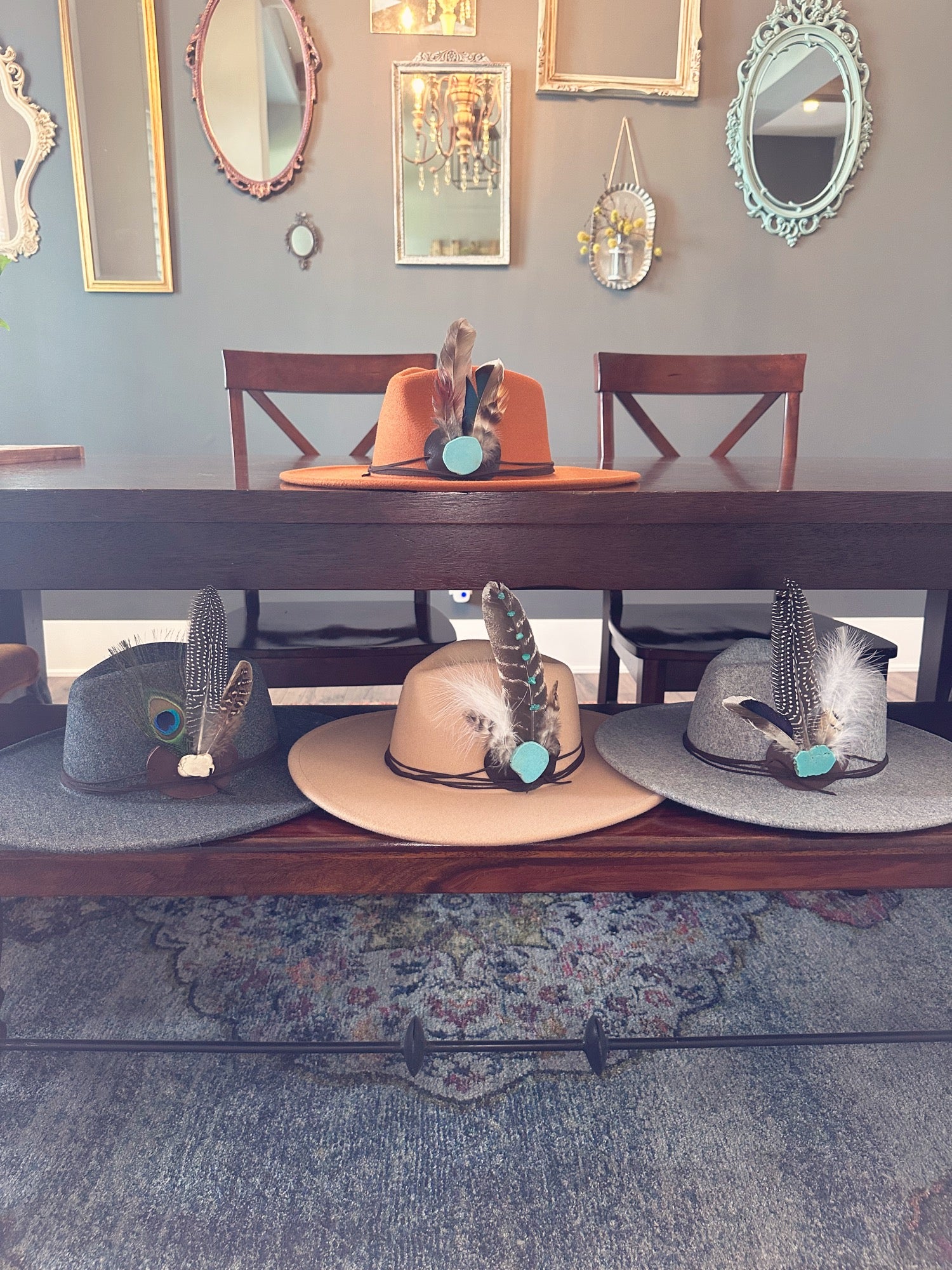 Our rancher hats are adjustable and come with the feather embellishments! One of a kind!