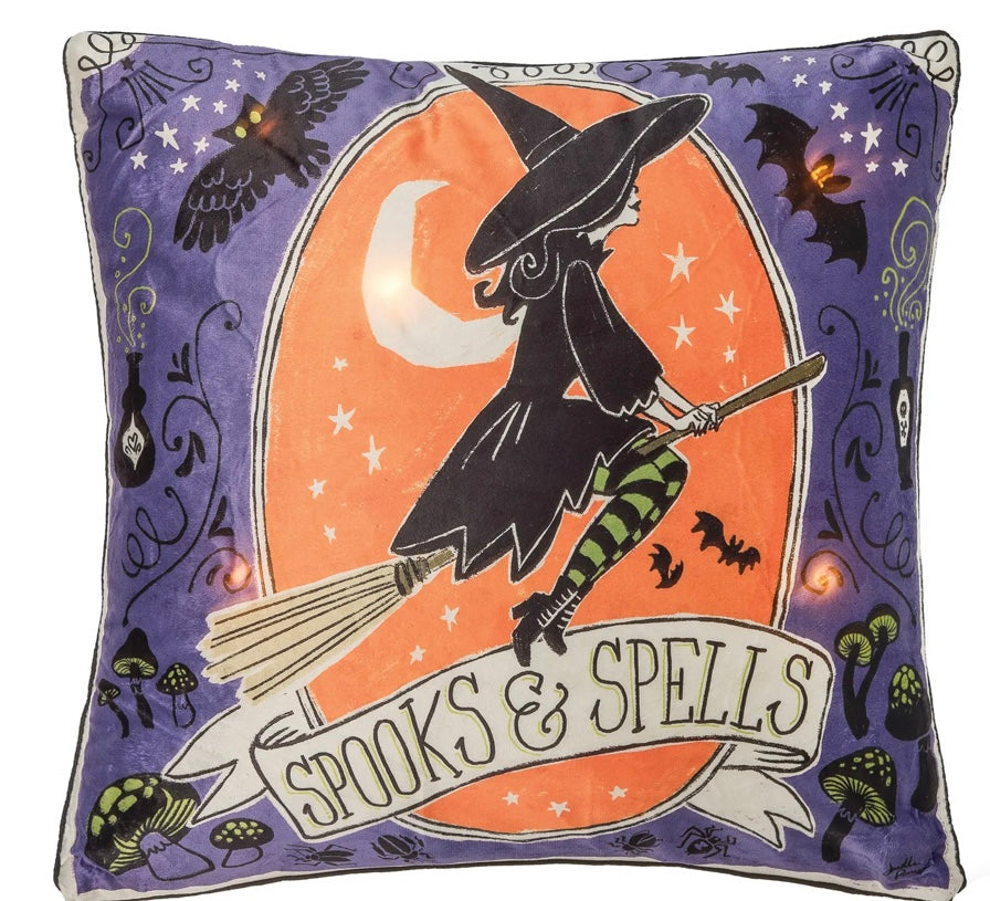 Decorate for the holiday season with our Spooks And Spells Witch Led Pillow. It is sure to bring joy to your home year after year. Product dimensions are 18" x 18" and product is made of Polyester.