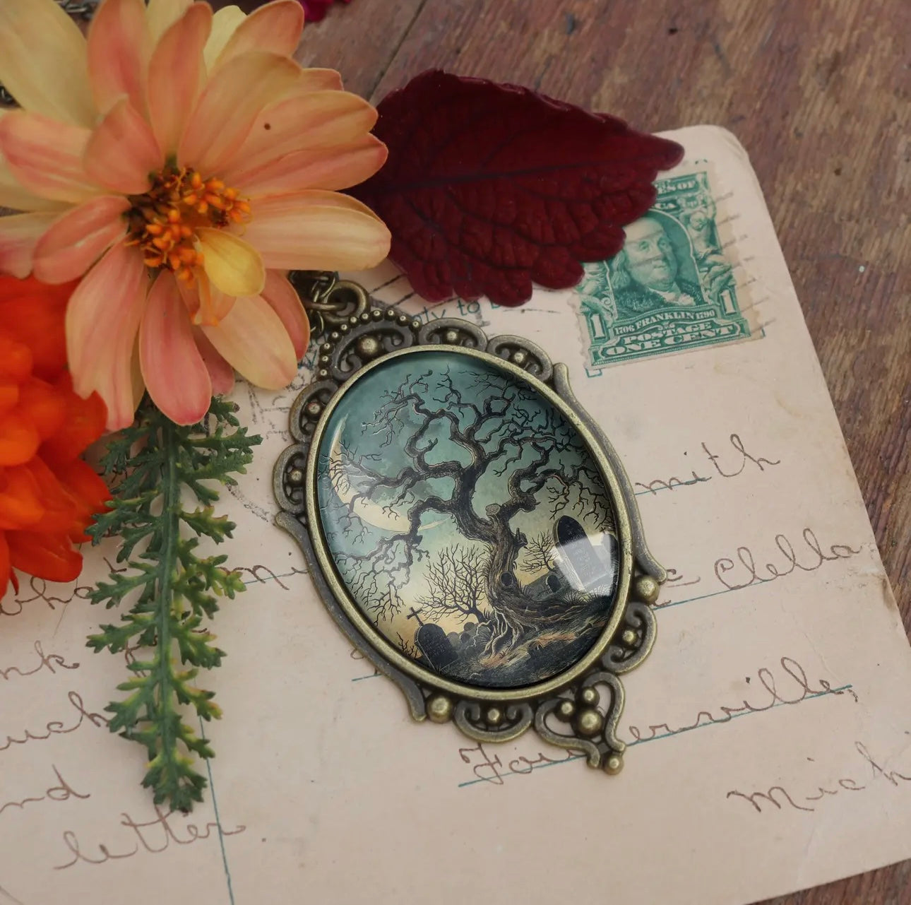 30x40 mm pendant. Our Haunted Tree Necklace comes on an 18” chain that is adjustable and nickel free!