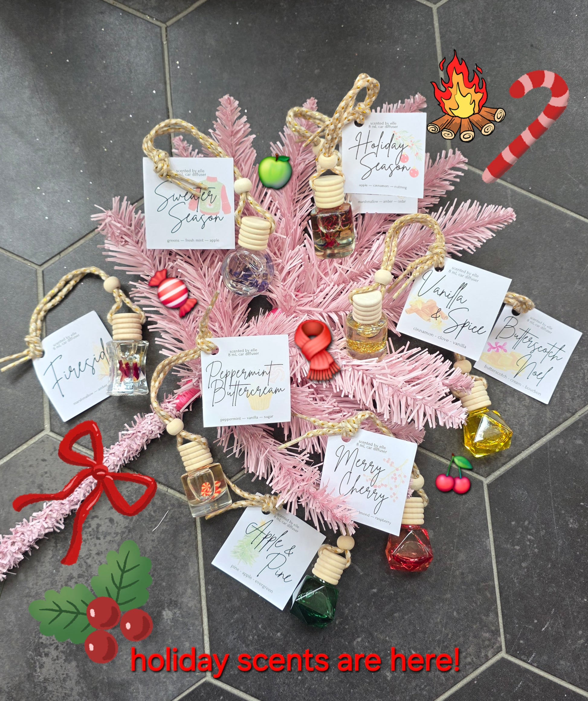Our car oild diffusers just got festive! Come in and smell these great holiday scents!