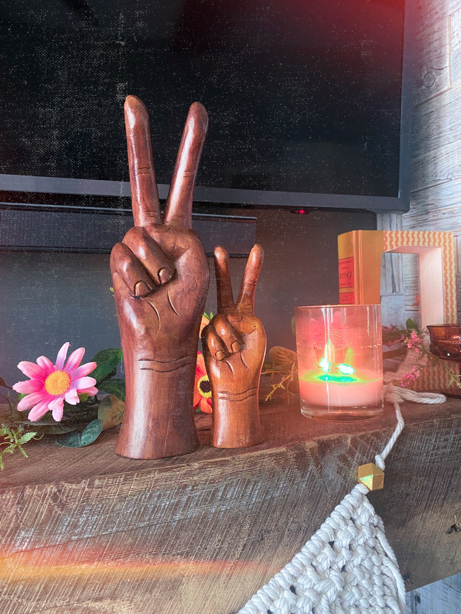 This 12” wood peace sign is carved by hand a perfect piece of decor or an awesome spot to keep track of your bracelets.
