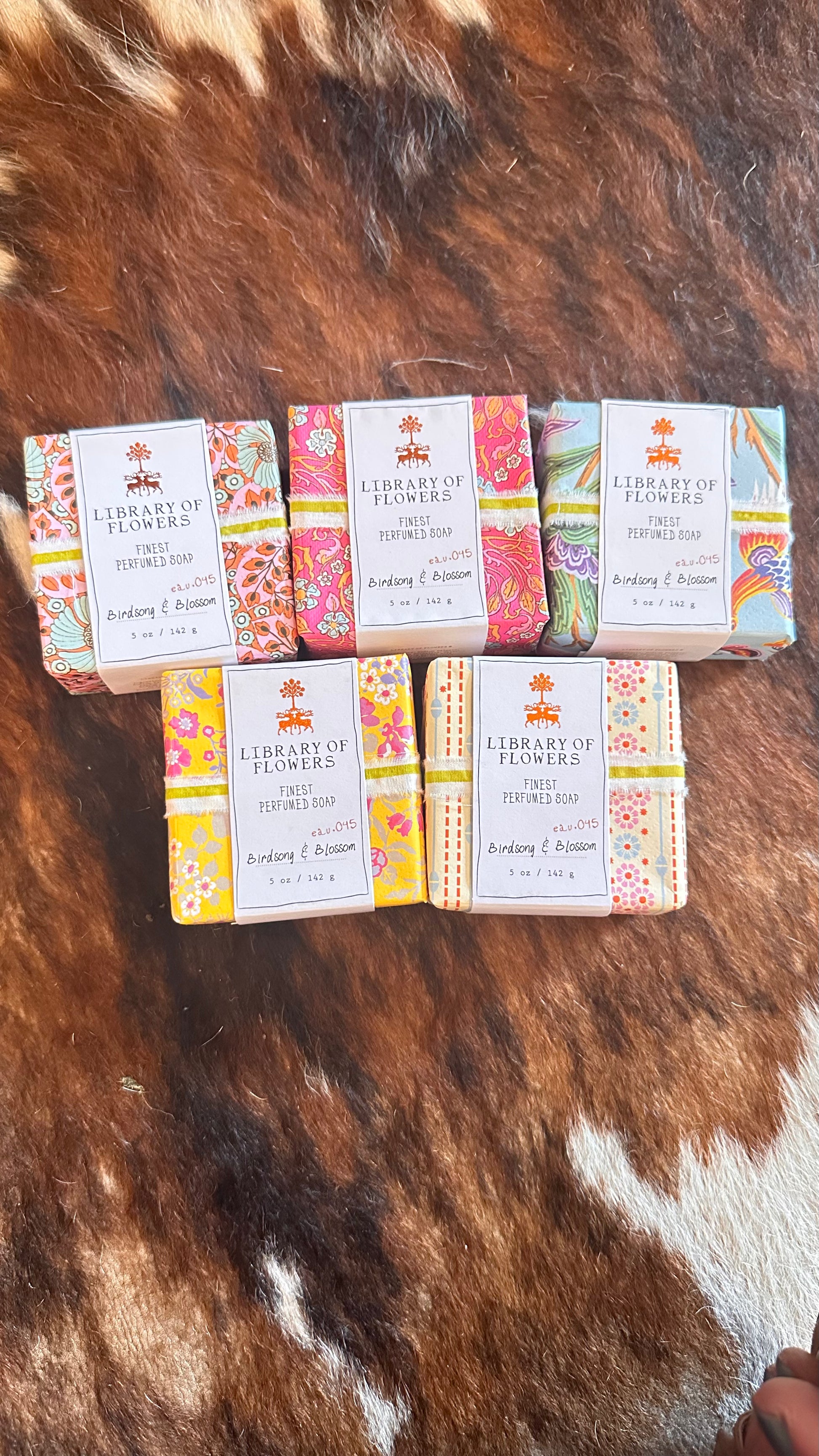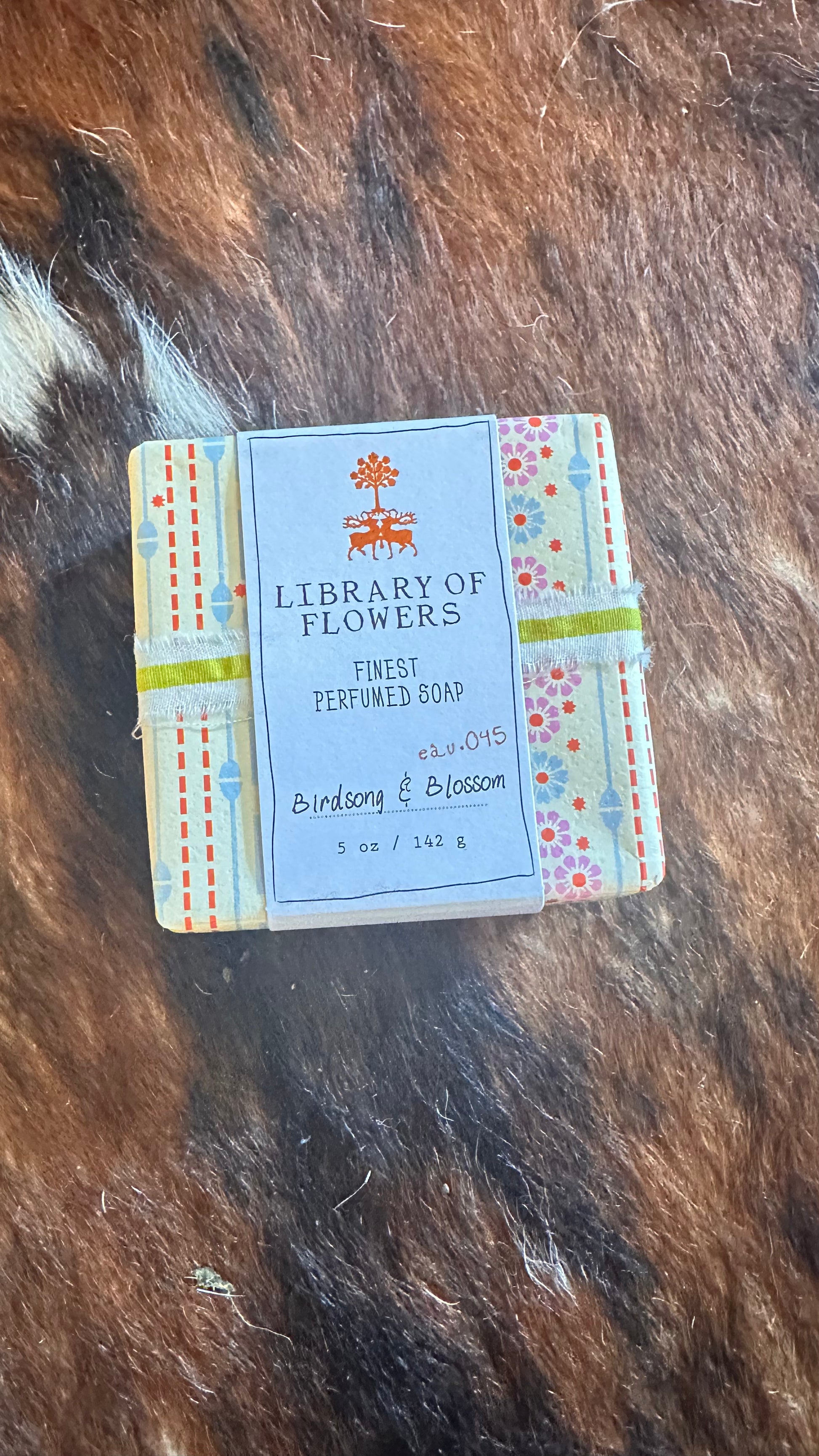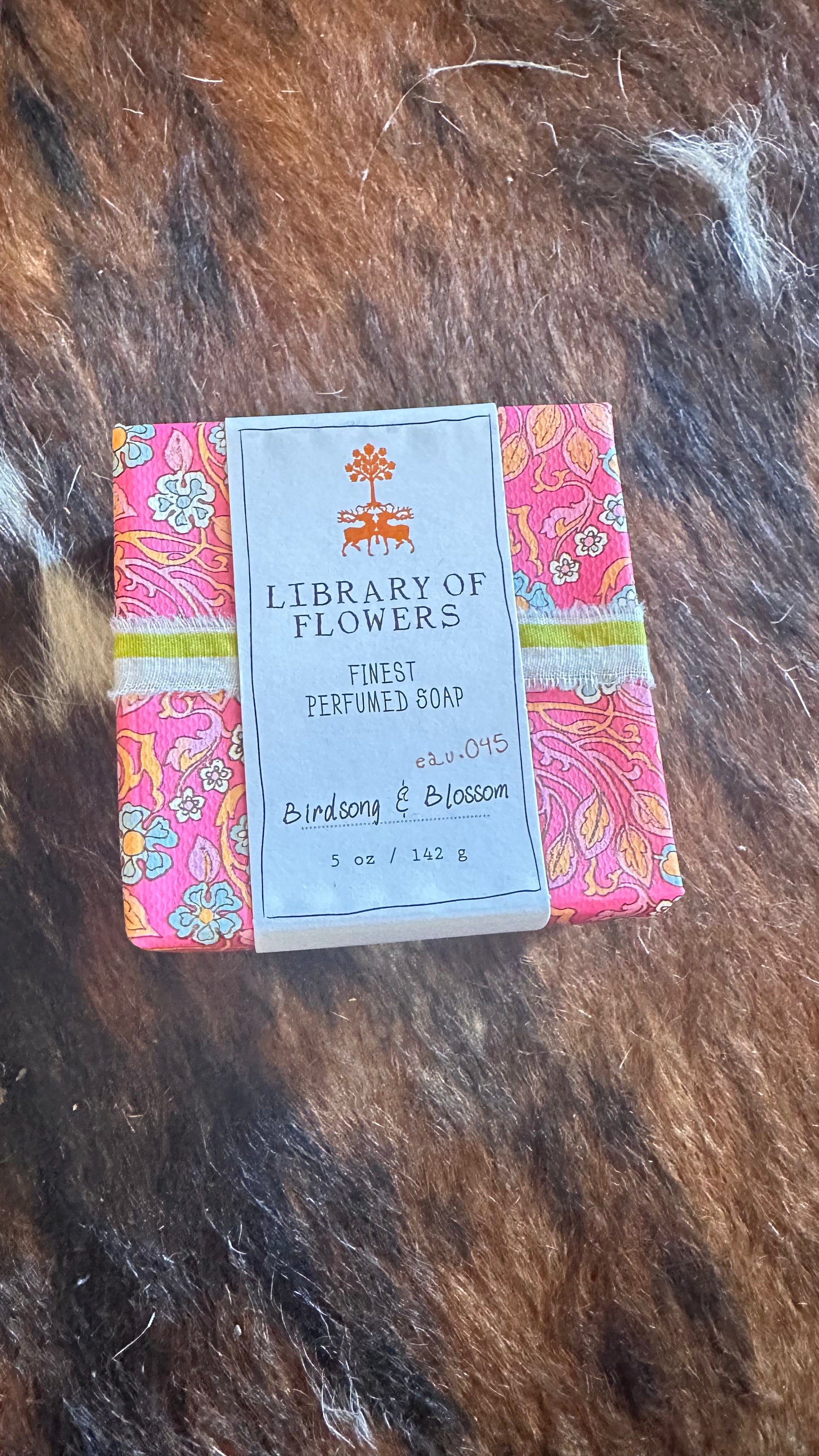 Library of flowers bar soaps make wonderful gifts or pamper yourself because each scent is absolutely amazing! Each soap is the same wonderful scent with Bergamont on the top, orange blossom in the middle, and sandalwood on the bottom, but you can choose your wrapping.