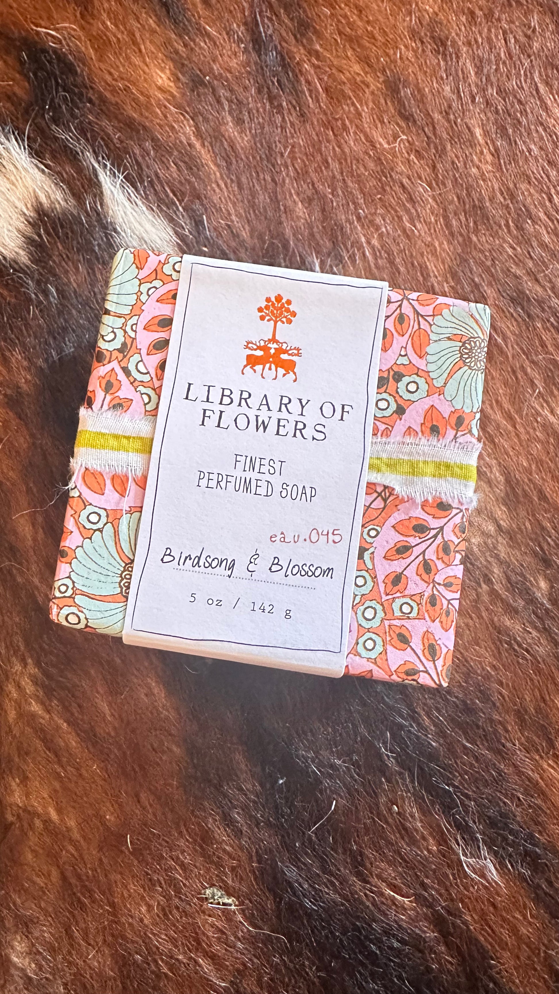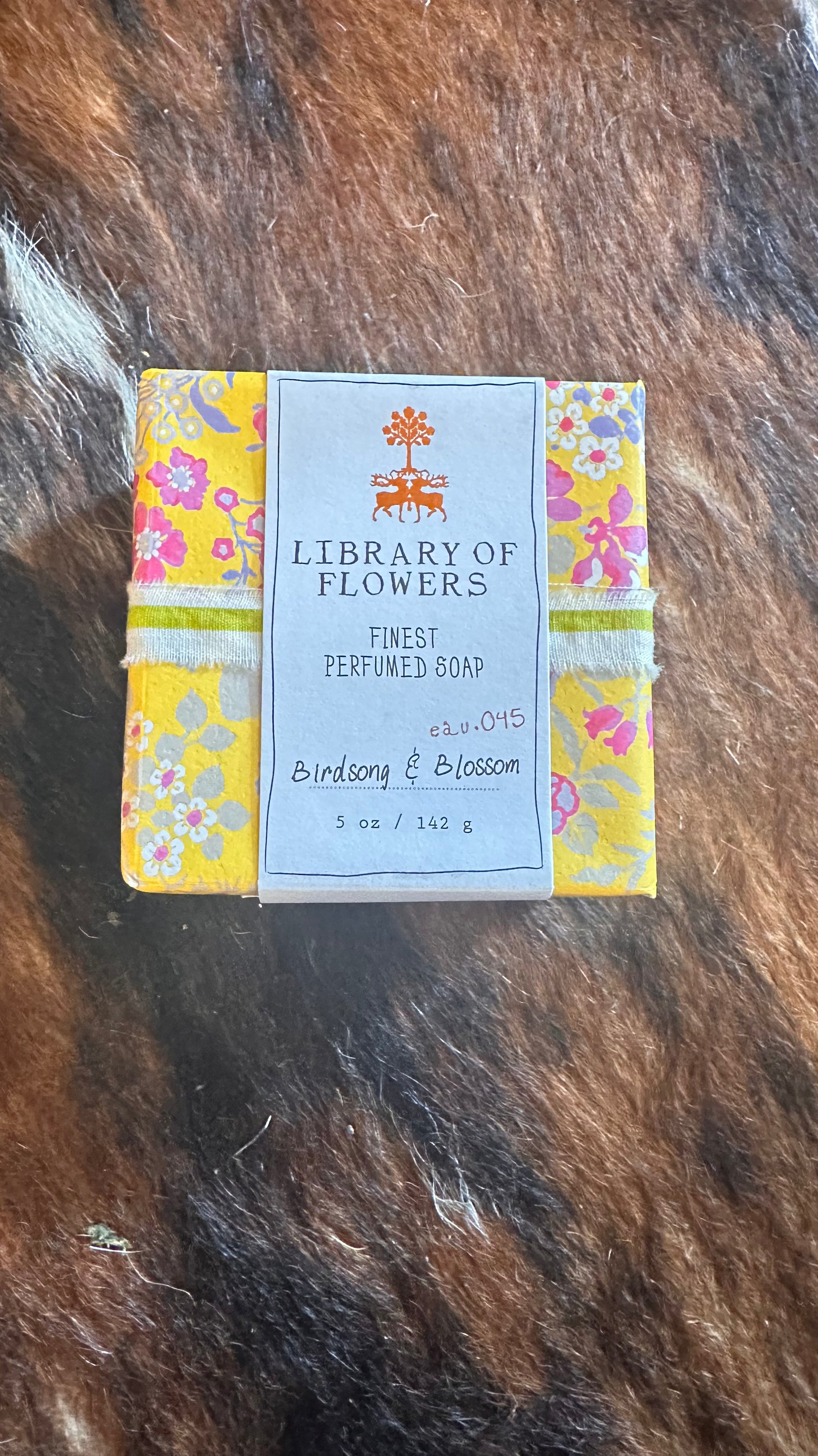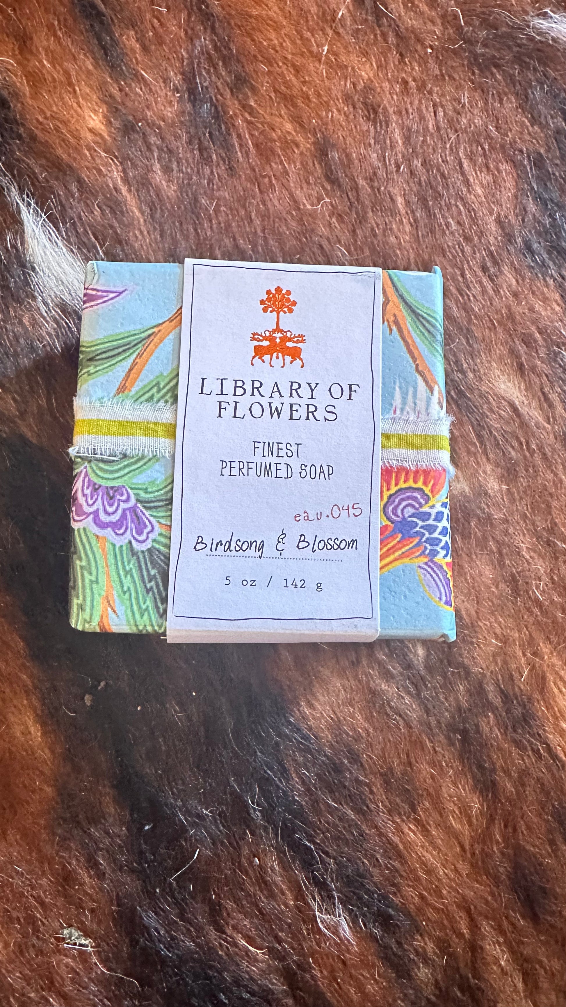 Library of flowers bar soaps make wonderful gifts or pamper yourself because each scent is absolutely amazing! Each soap is the same wonderful scent with Bergamont on the top, orange blossom in the middle, and sandalwood on the bottom, but you can choose your wrapping.