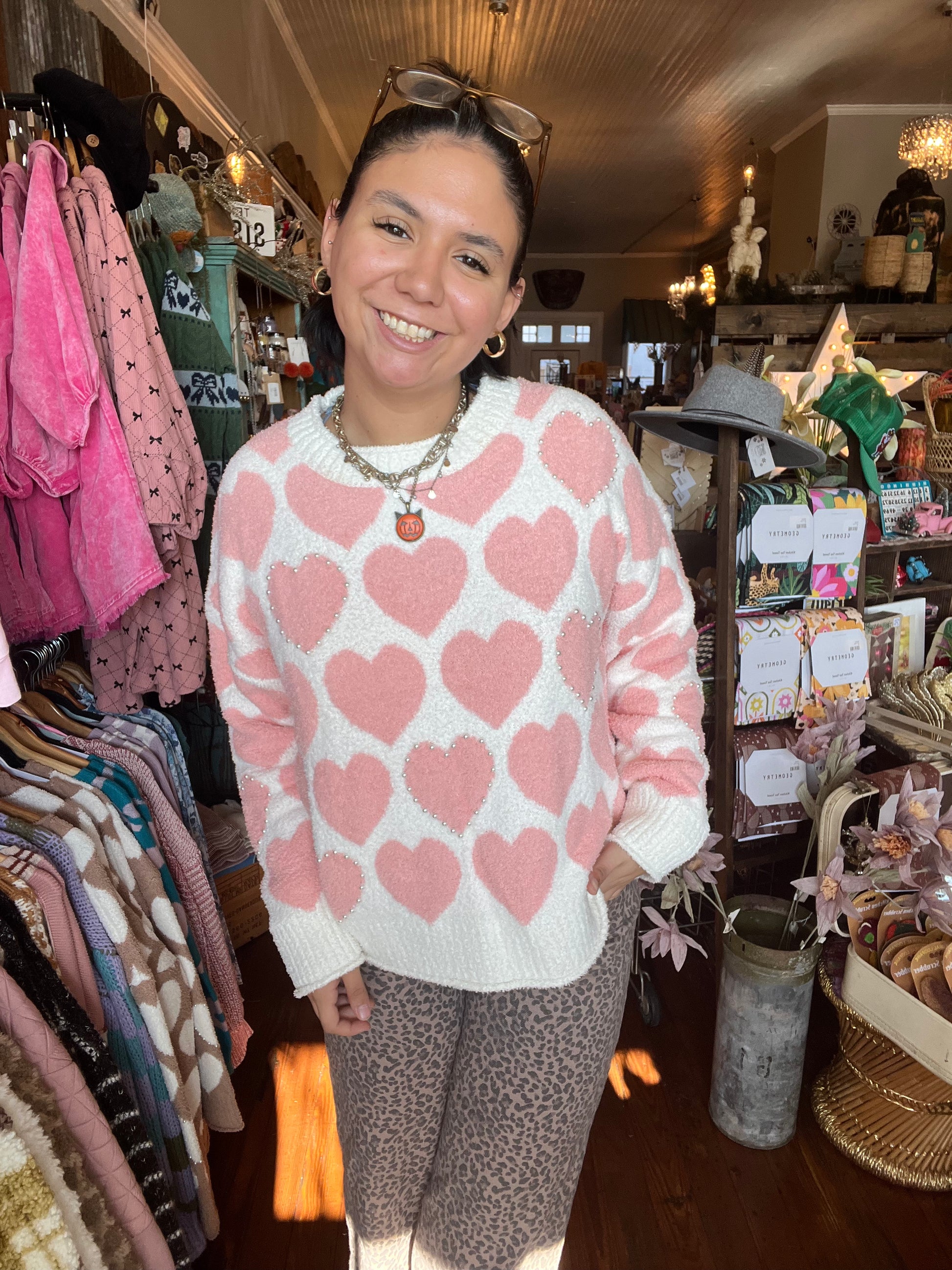 The softest sweater comes in these pretty baby pink hearts or taupe hearts! Notice the little pearl embellishment!