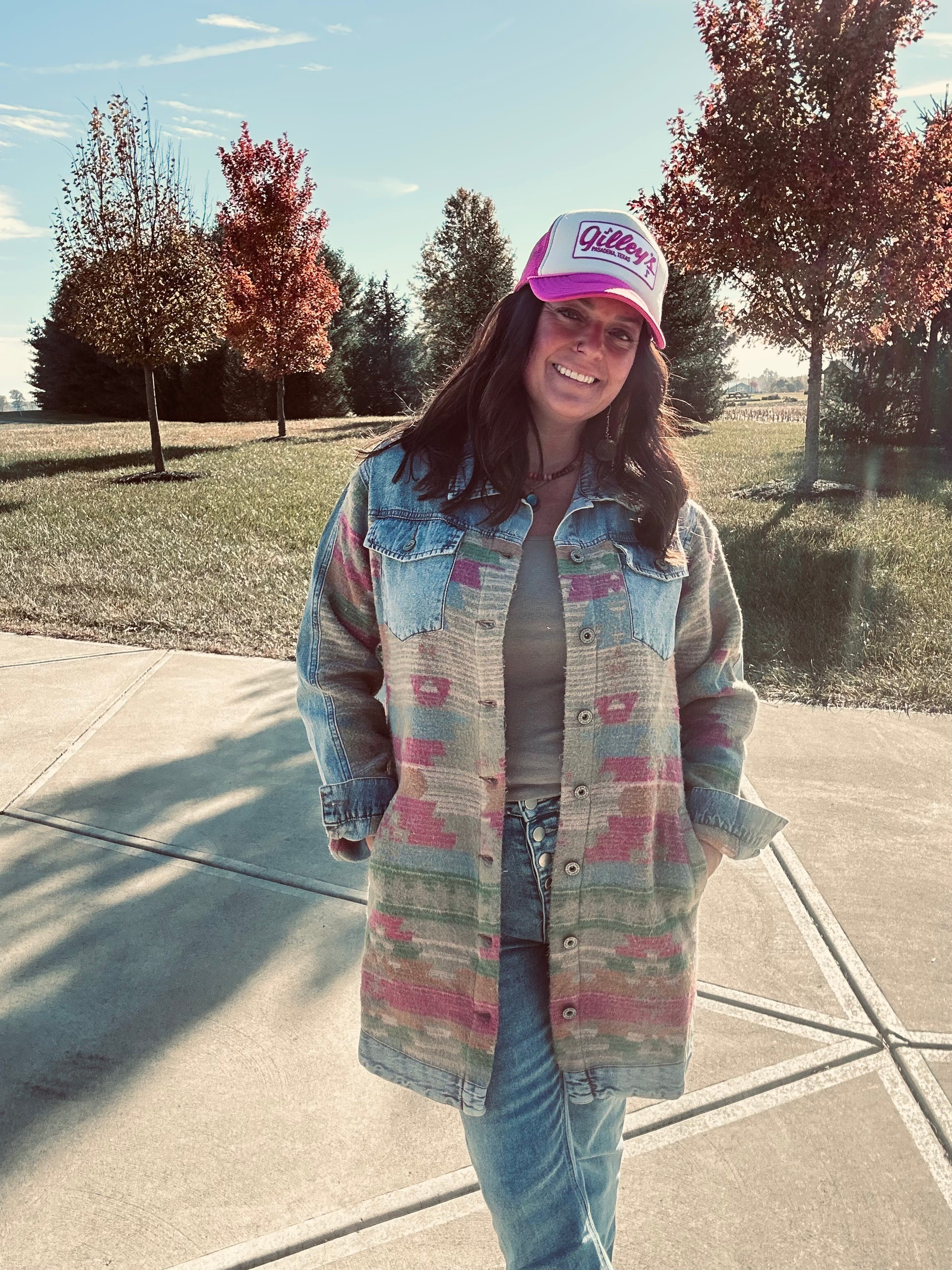 This jacket lands mid length with this cozy Aztec print that will remind you of a southwestern sunset!