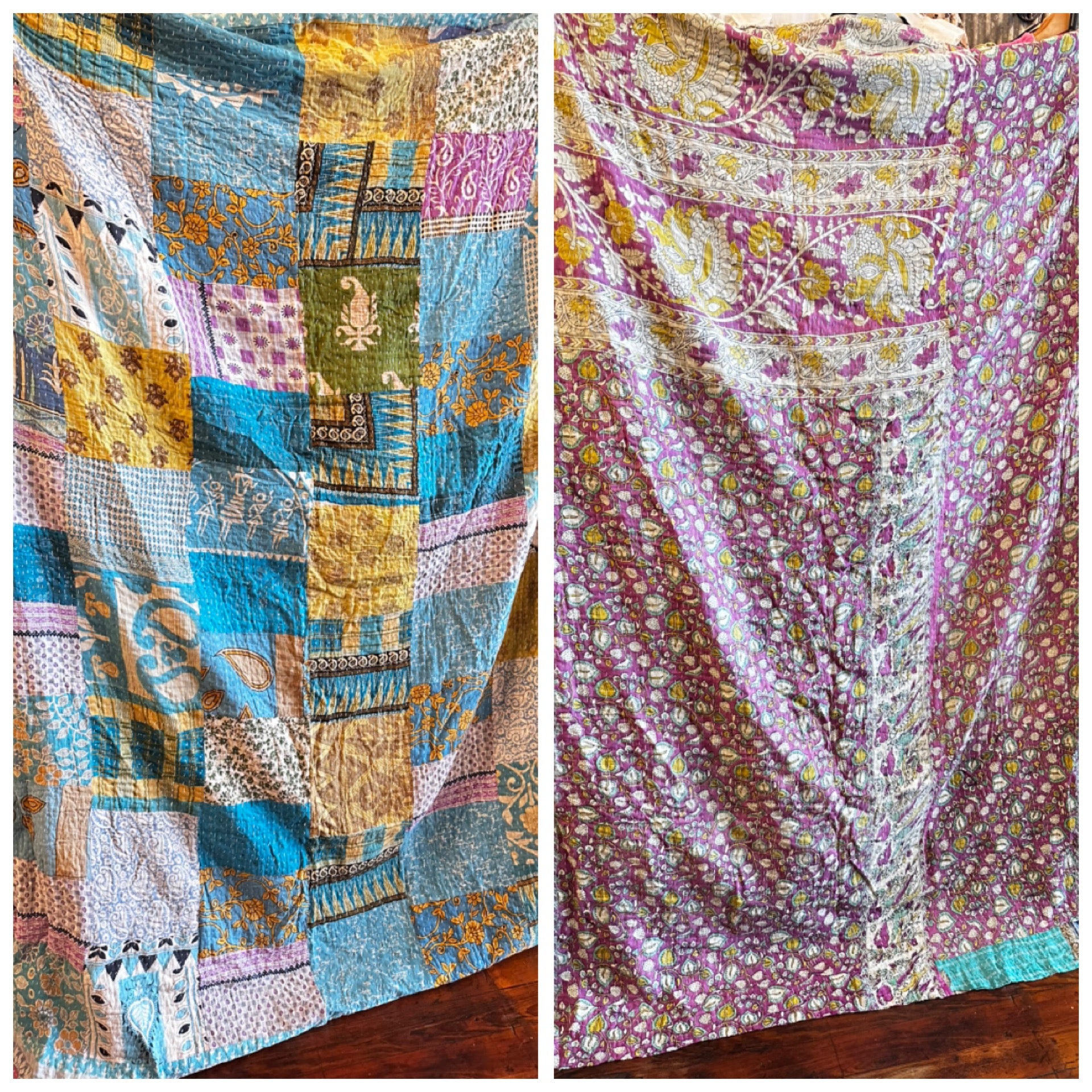 Our reversible twin quilts are so fun! Made with kantha material, no two are alike!