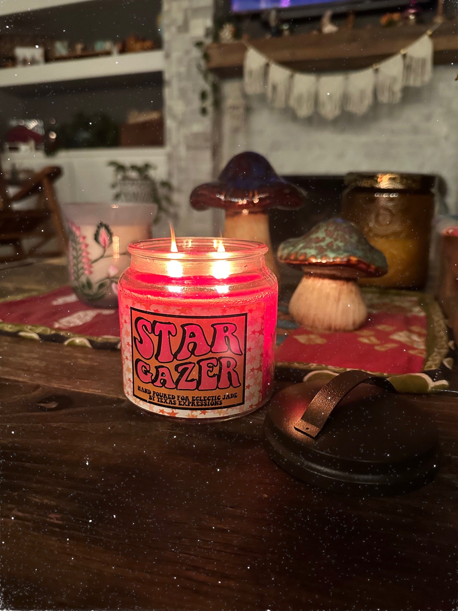 This is an exclusive Eclectic Jade item. The Star Gazer Candle is a reminder of the heart shaped candies with a blend of cinnamon stick, cinnamon leaf, and cinnamon spice.