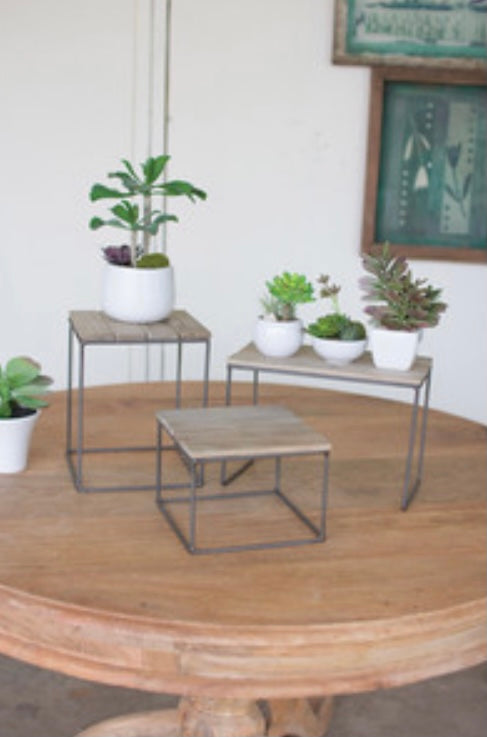 The smallest table top riser measures 6” tall by 8” wide. The large one measures 8” wide by 10” tall