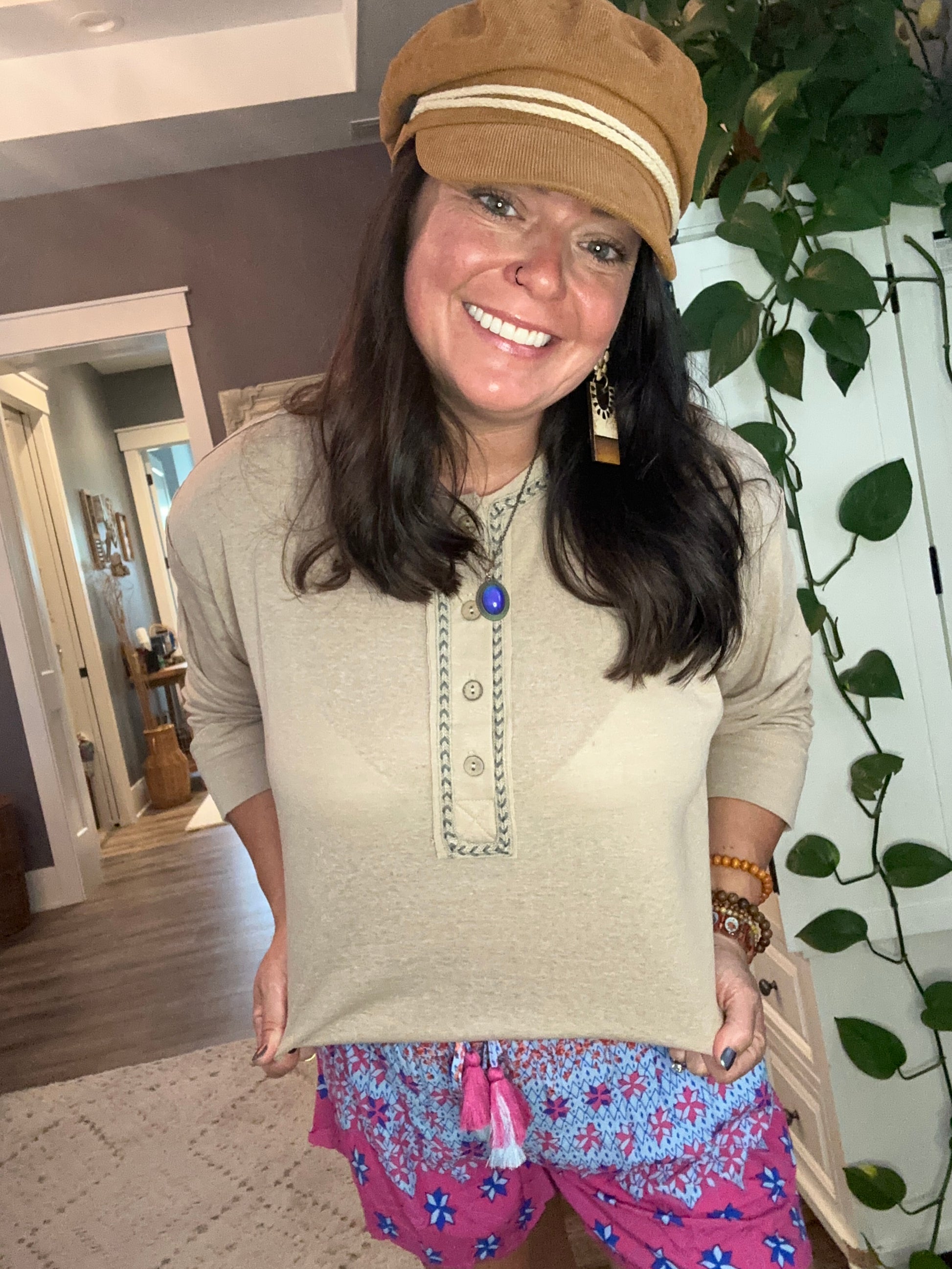 Lightweight tan top with the perfect little neck embellishment. Perfect for a summer night!