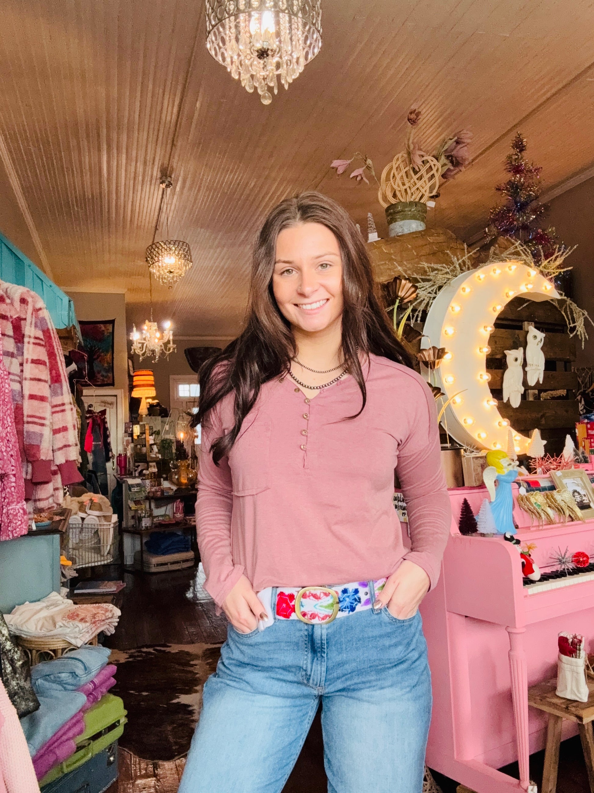 This thin top is such a pretty shade of mauve. Pair it with some of our colorful patchwork pants for a fun look.