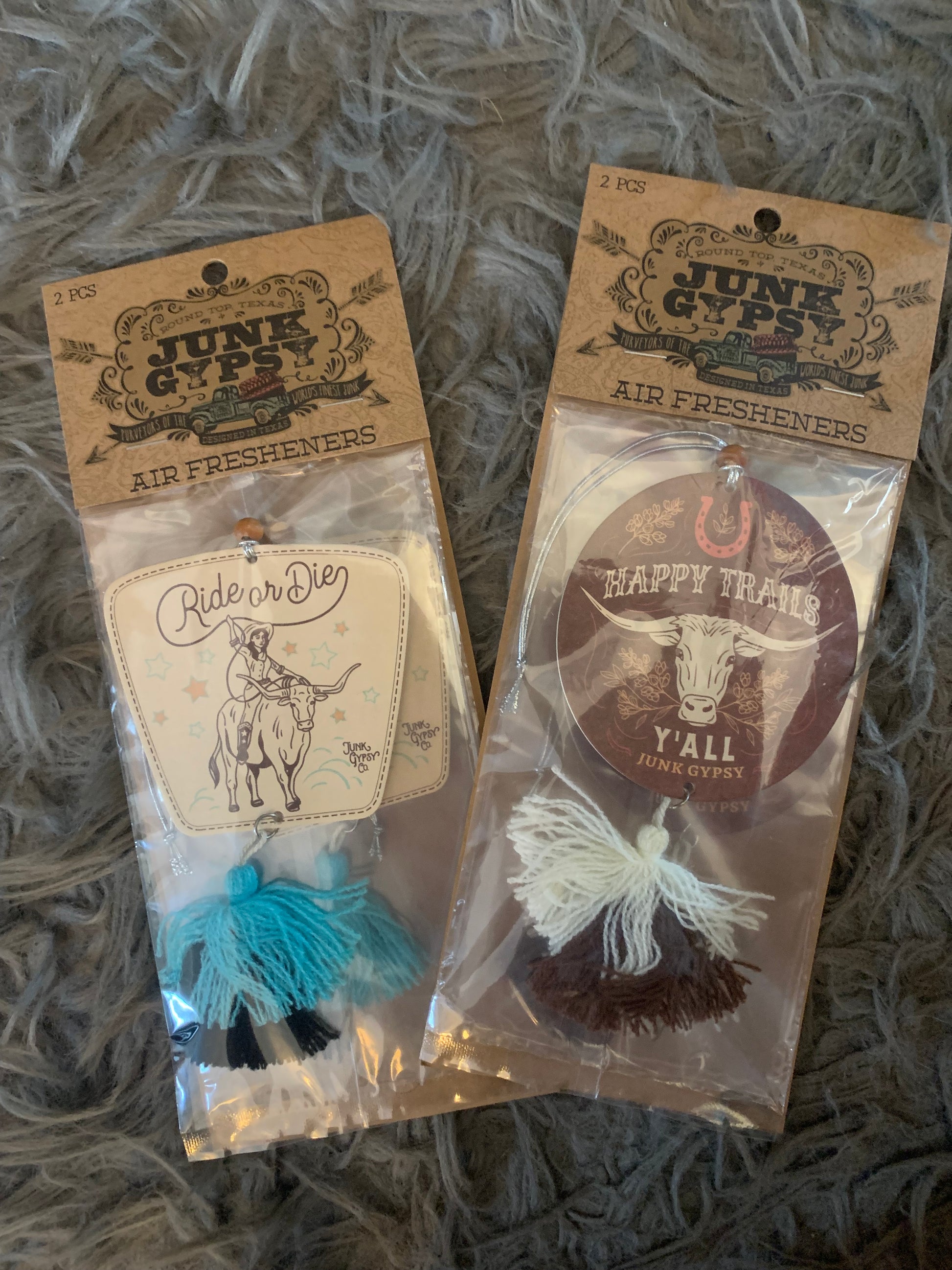 Put your boots up on the dash and enjoy the sweet scents of our JG car air freshies!