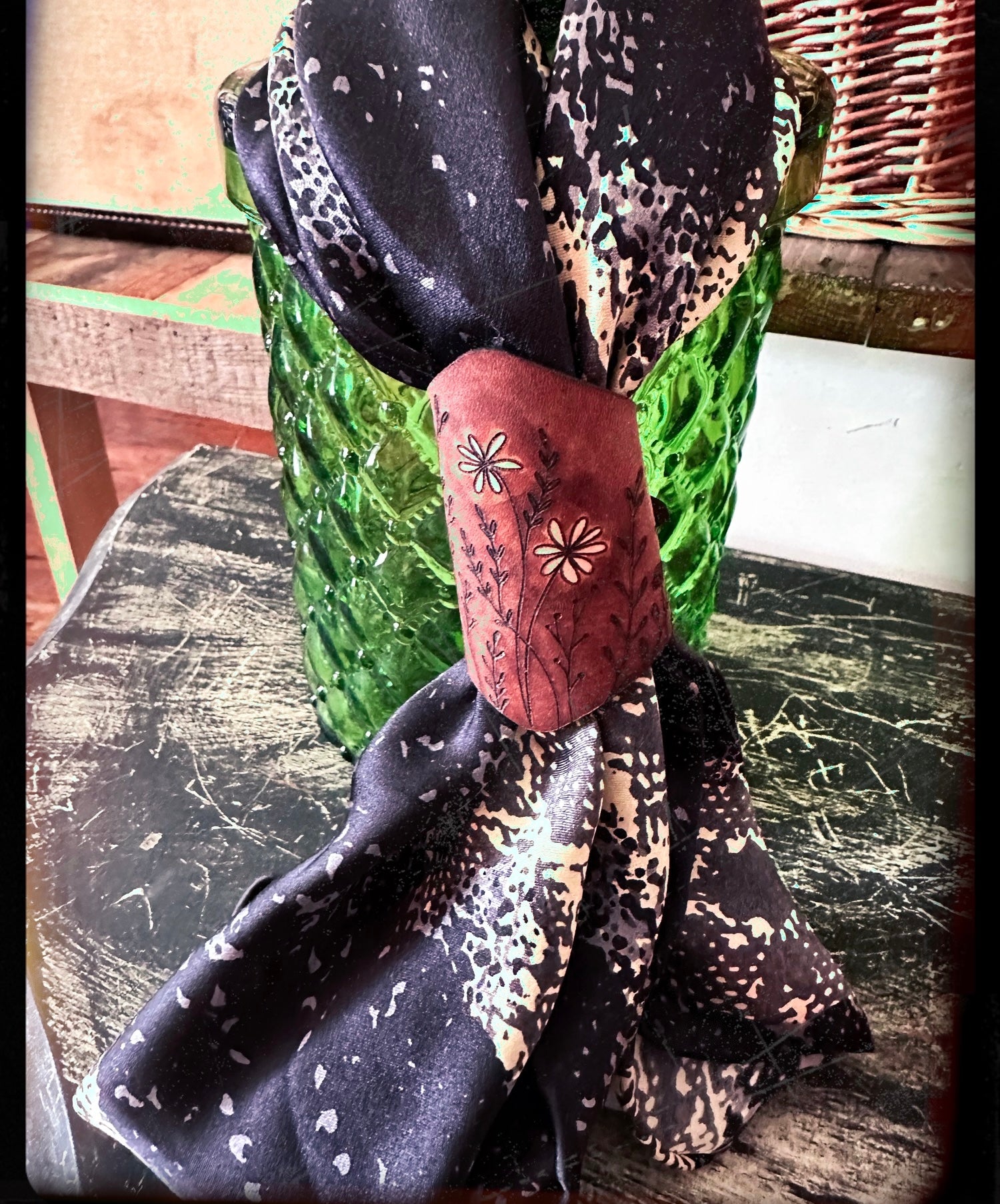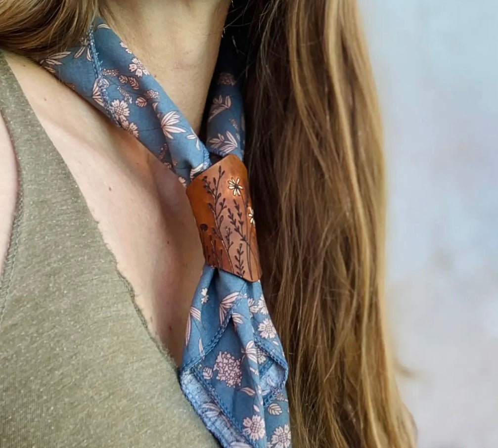 This adorable bandana bolo is the perfect addition to your wardrobe this summer. Wear it for work outdoors, to keep you cool, or just because it’s totally rad. An assortment of wildflowers decorates this snap slide. Hand dyed to perfection, this slide is secured by collecting your scarf or bandana, and snapping it around both sides. This slide can be used on any scarf or bandana! Get to Know Your New Bandana Slide + Handmade from scratch, this adorable slide is totally eye-catching + The slide can be used on any scarf or Bandana