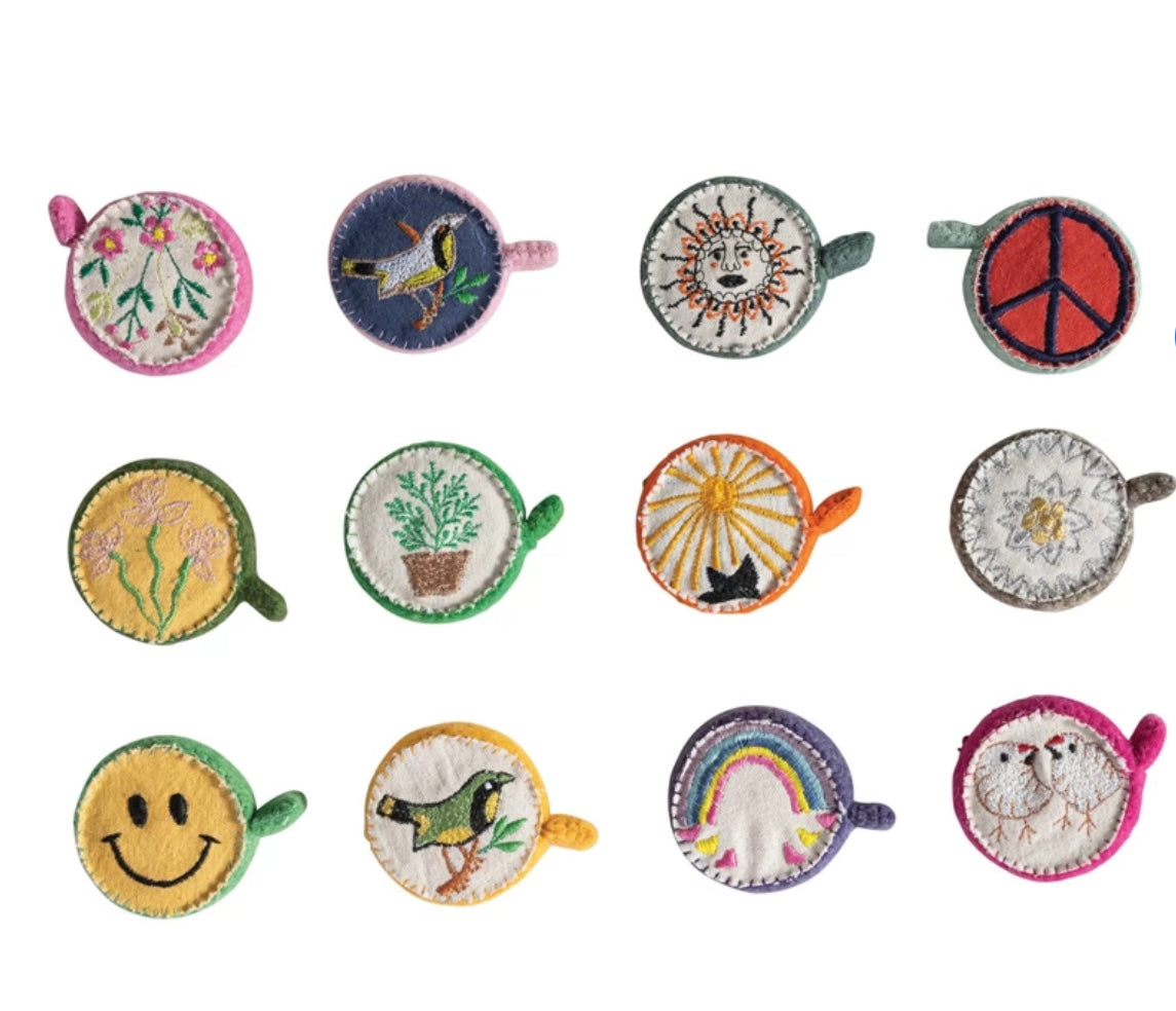 Materials: 60% PVC, 35% Wool Felt, 5% Canvas. 2" Round Handmade Embroidered Wool Felt Tape Measure, Multi Color, 12 Styles (Each Measures 5 Feet)