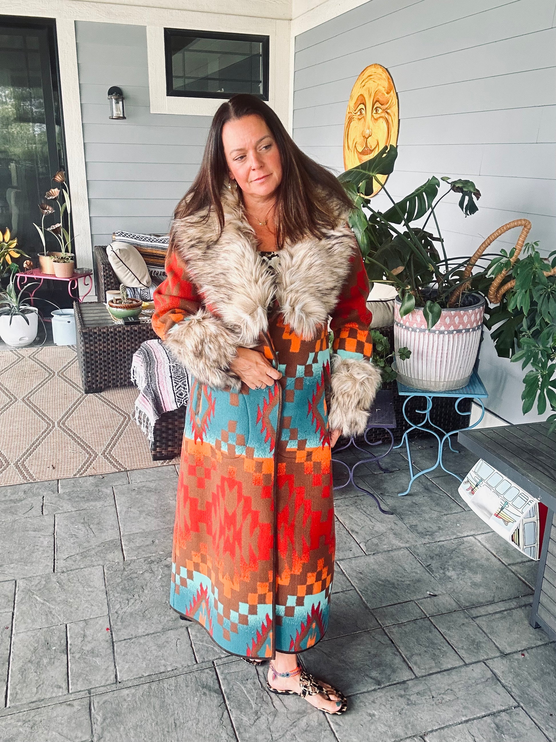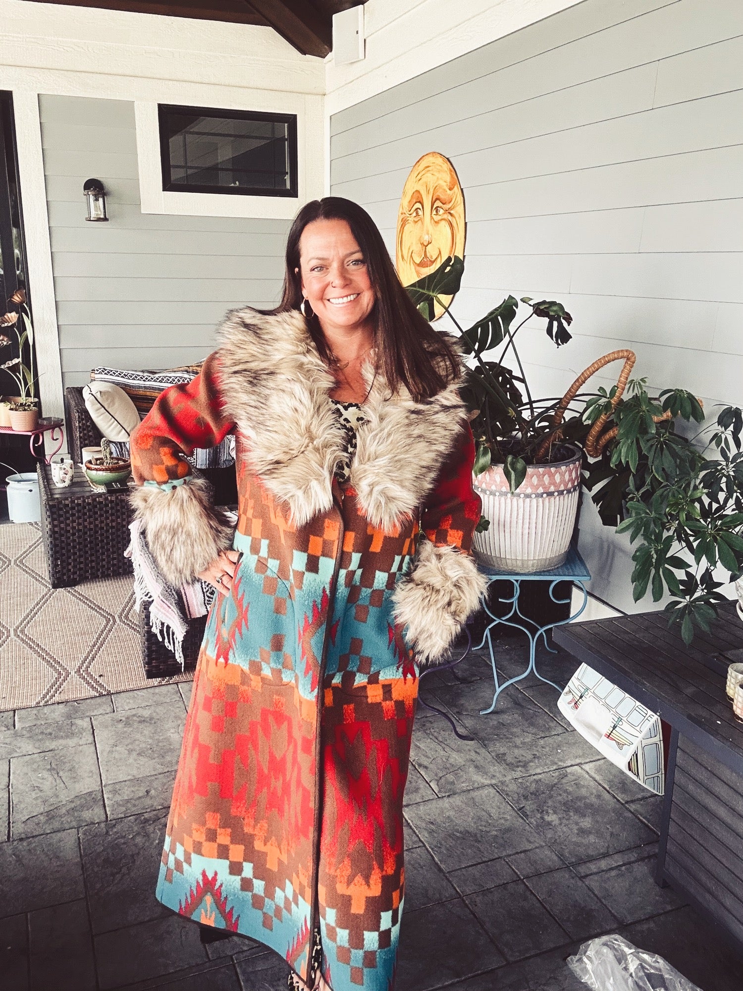 This amazing Tasha Polizzi coat comes with fur on the arms and the neck that is removable and it is the softest coat you will ever wrap your body in! Made of this luxurious blanket material you will feel like $1 million bucks!